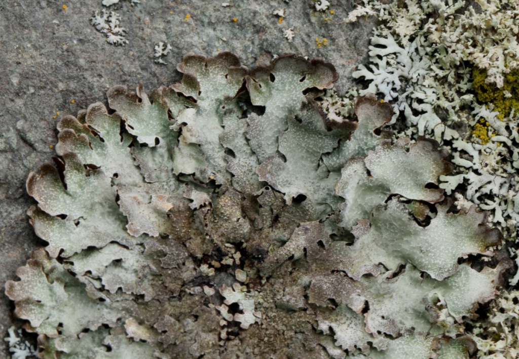 Thallus foliose, pale grey, sometimes green-grey in shade, becoming brown at drying lobe tips. Conspicuous, white pseudocyphellae are found on the lobe surfaces. Older parts of the thallus become densely isidiate, the isidia shining, or often pruinose, arising initially from the network formed by the pseudocyphellae. Was once used to produce a reddish-brown dye.