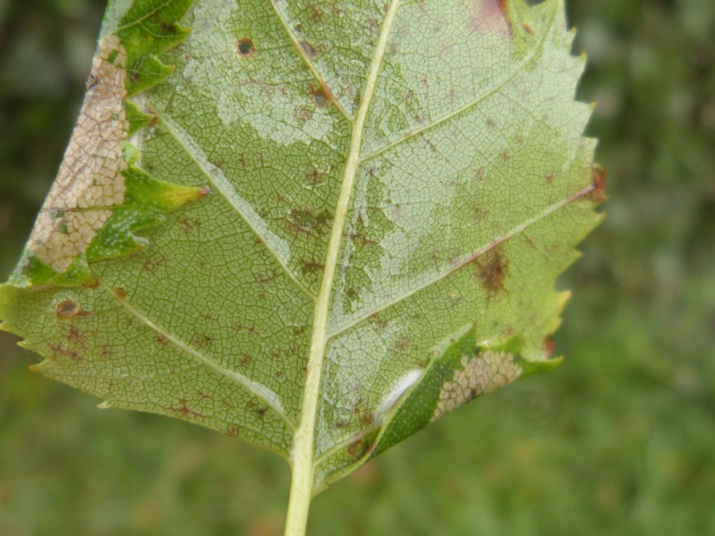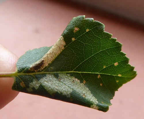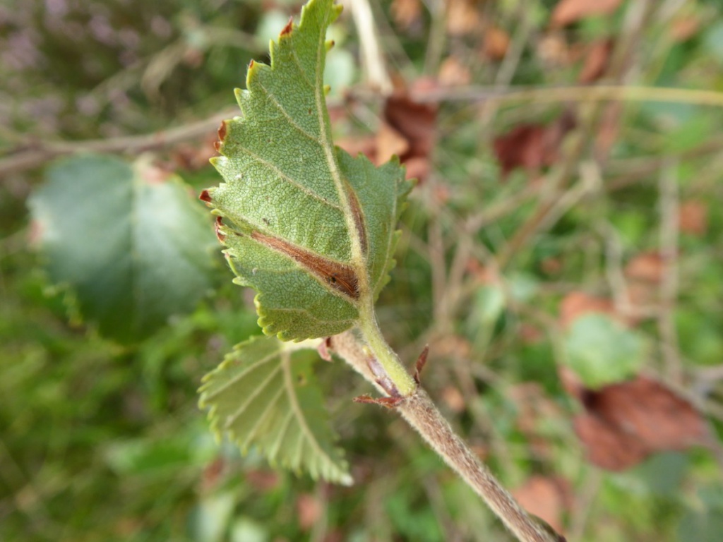 The larvae later feed within downward folds, usually at the tip of the leaf, pupating in this site or on the ground. The mines can be found in June and again in September to October and are commonest on birch seedlings.