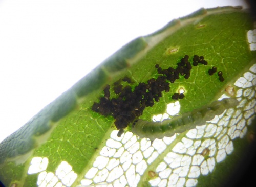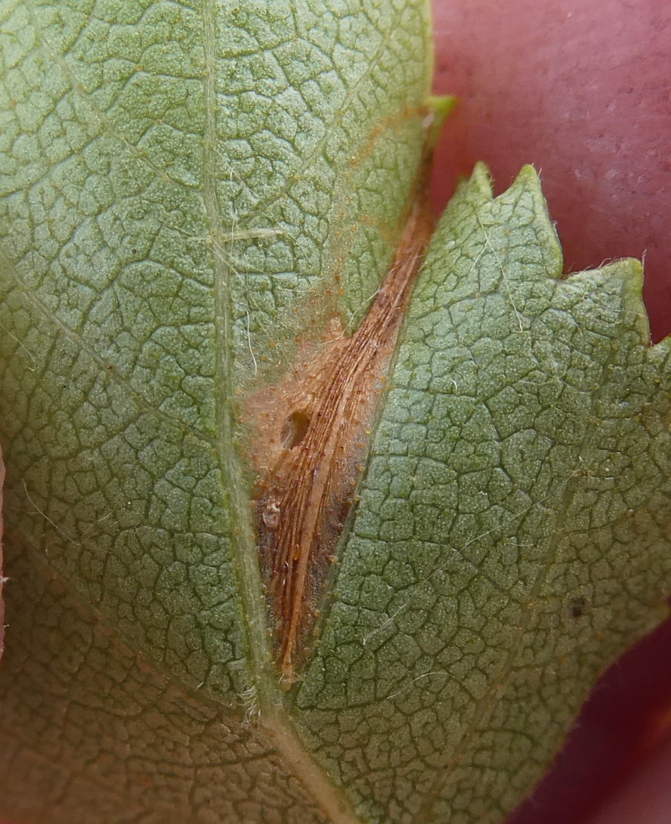 Photograph under-surface of tentiform mine, folds in leaves, and larvae. Note host species
