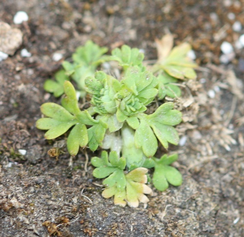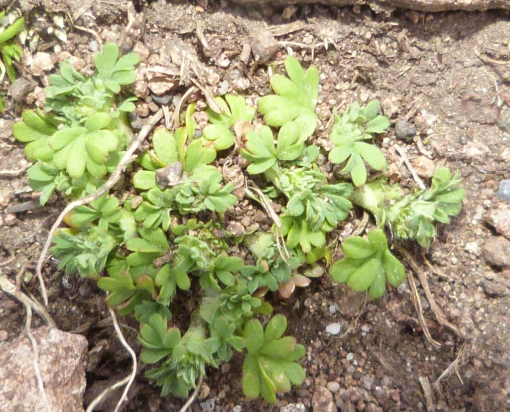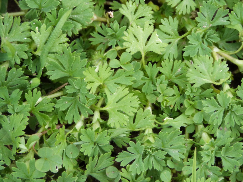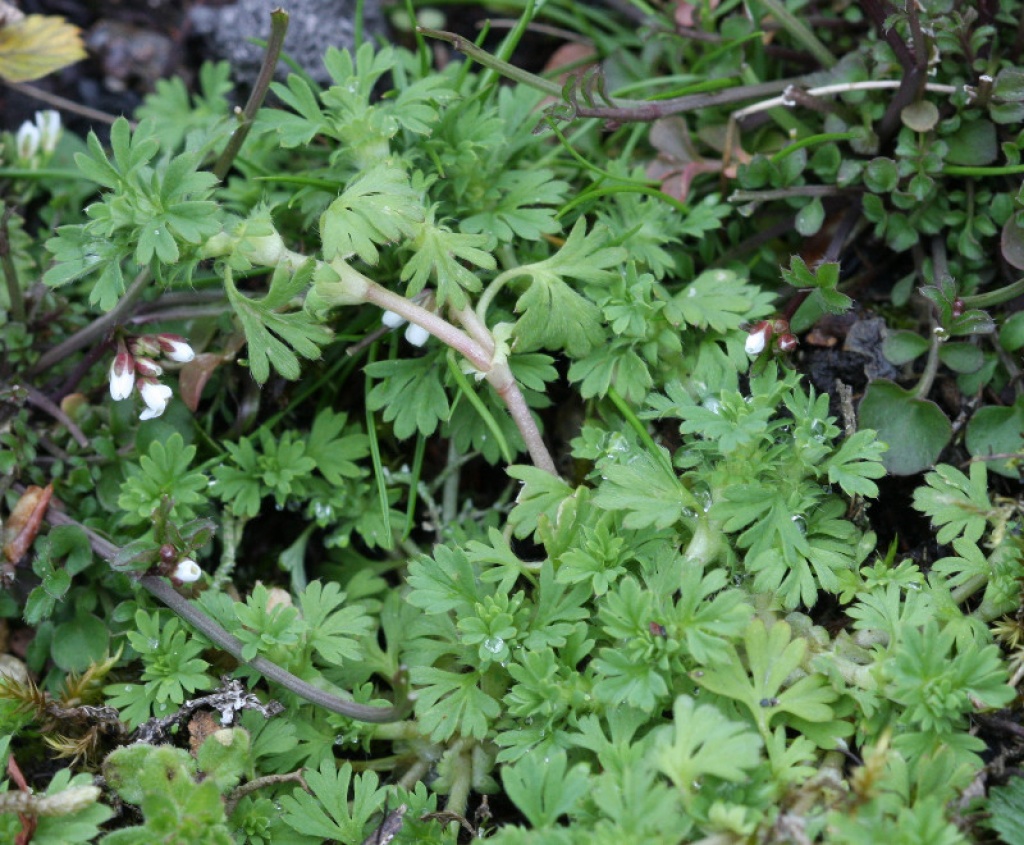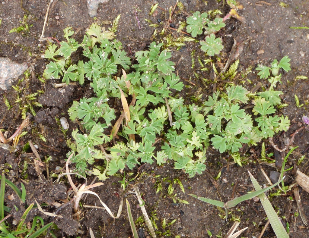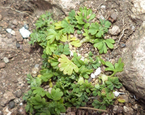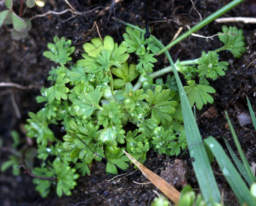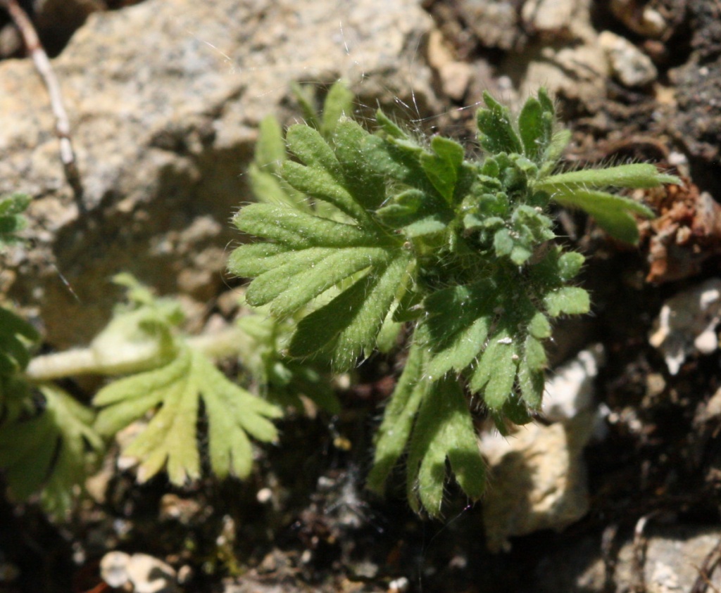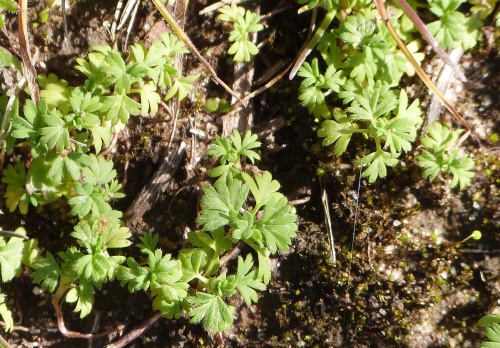 Small prostrate annual, deeply palmately lobed leaves, 0 petals, 4 sepals