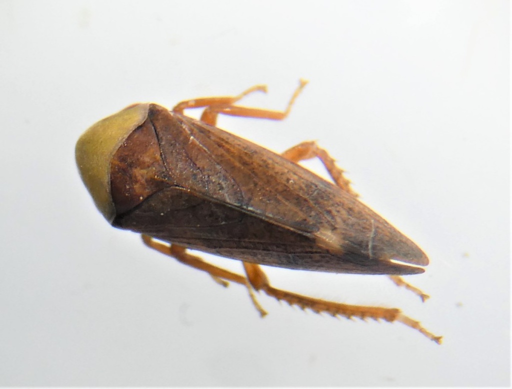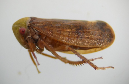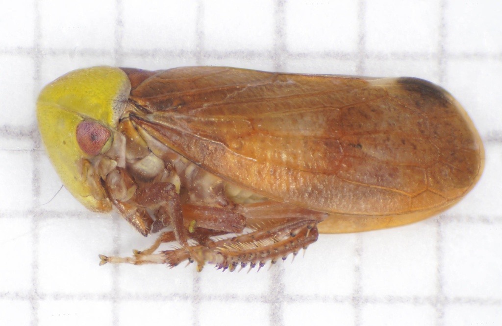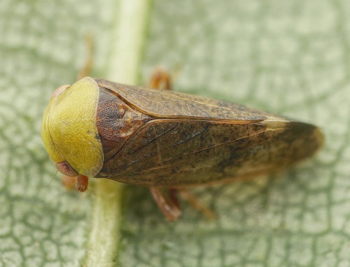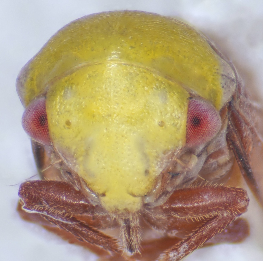 Length 5 to 6 mm. From above, the large yellow pronotum obscures most of the vertex. The face is plain yellow, without markings, and the wings are brown.