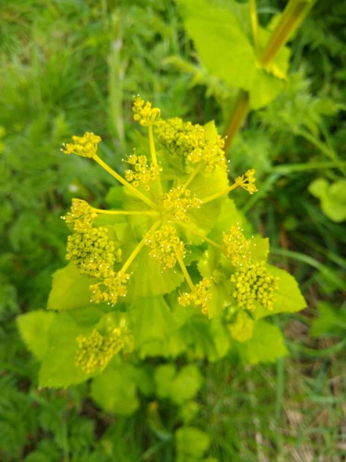 Superficially similar to Alexanders (Smyrnium olusatrum) with umbels of yellowish flowers, but only grows to about 60cm, half the height of Alexanders, and has yellowish-green leaves rather than the dark glossy green of Alexanders. Another difference is that the leaves strongly clasp the stem, encircling it.