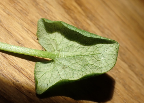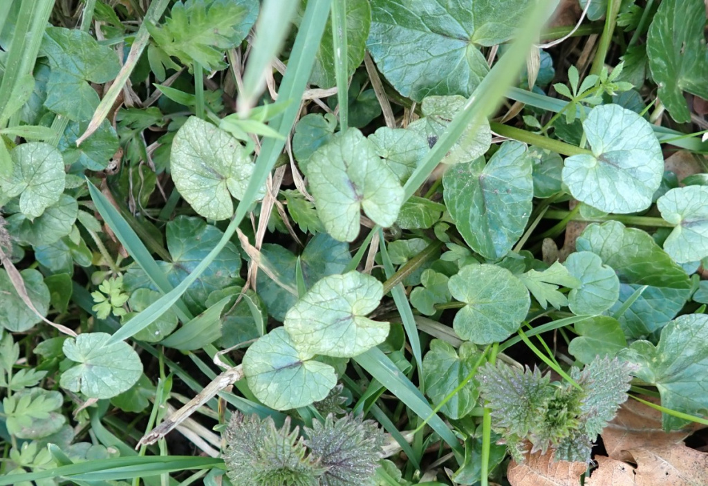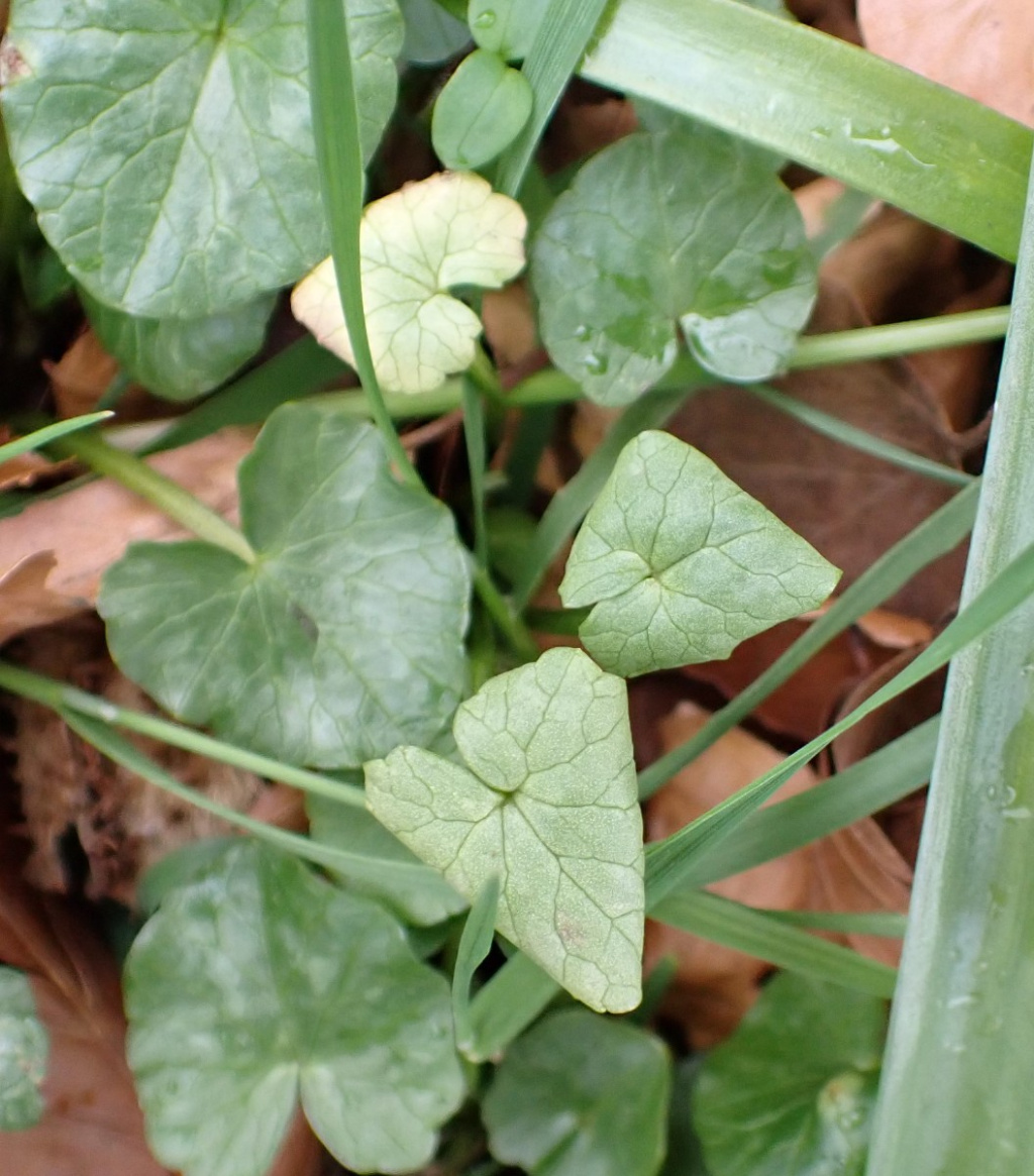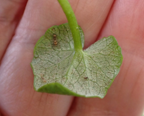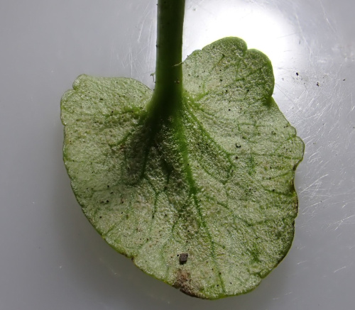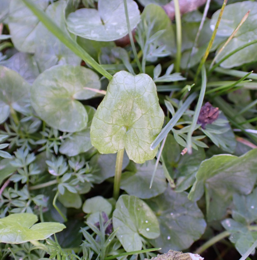 This downy mildew affects Lesser Celandine (Ficaria verna) producing a greyish down on the undersides of the leaf.  Affected leaves are often yellowed and with the leaf blade curled back; leaves may have longer petioles and stand up from the unaffected leaves.  This is considered to be a gall-causer.