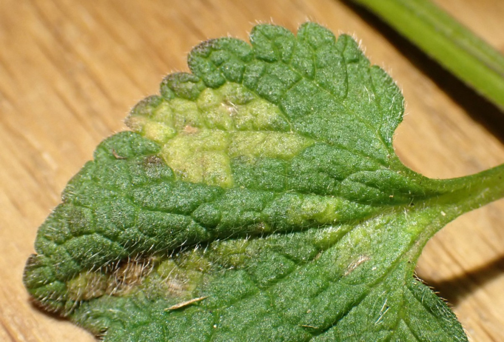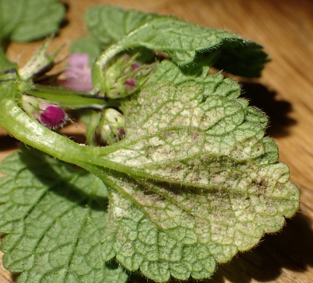 The downy mildew affects Lamium species (Dead-nettles). The leaves have yellowish or brownish spots, and the underside has greyish-purple down.
