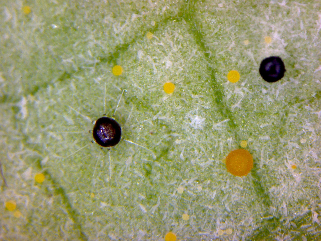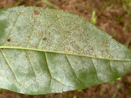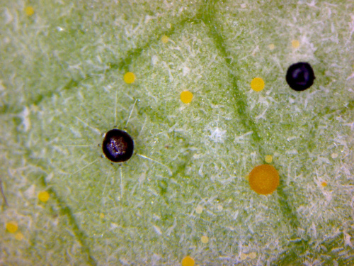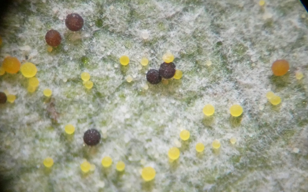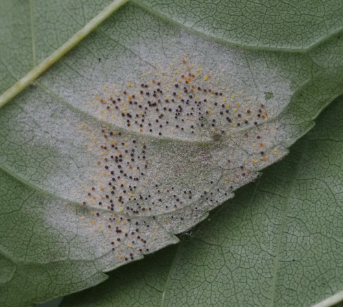 This is a powdery mildew occurring primarily on Ash (Fraxinus), but may also be present on Lilac (Syringa). The sexual state (teleomorph) is visible as small yellow, orange, brown and black spheres on the leaf underside, caught in the mycelium. The chasmothecial appendages are straight and swollen at the base.