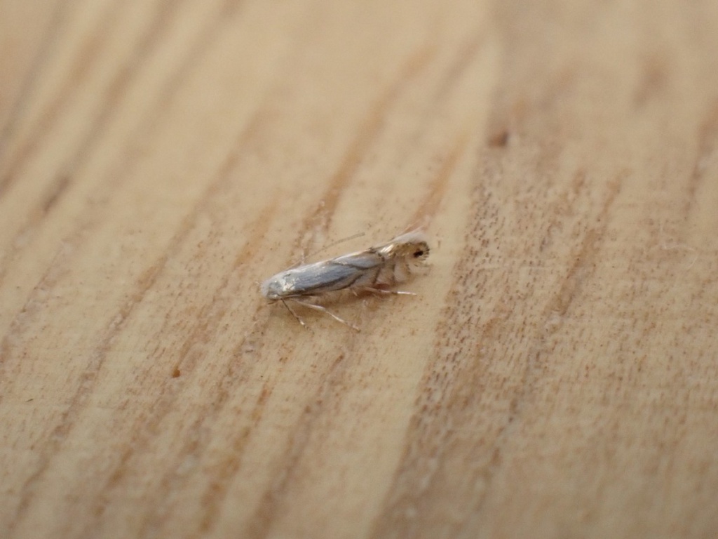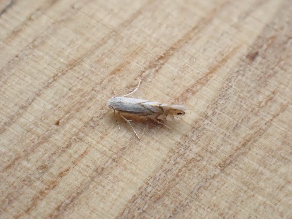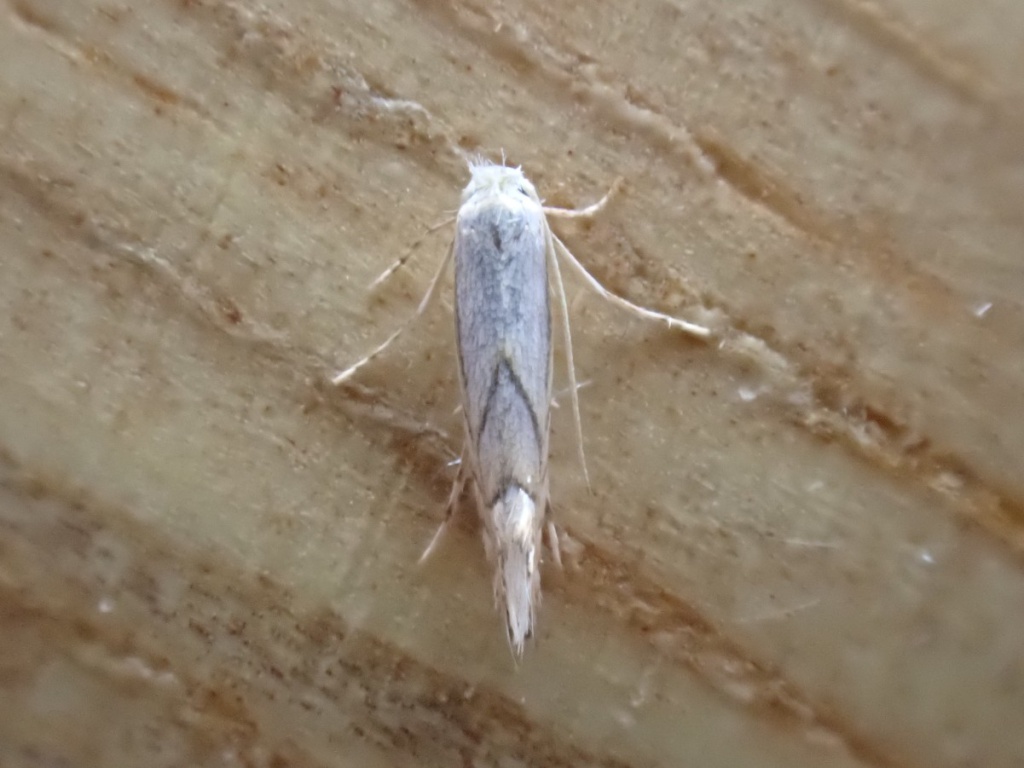 Wingspan approximately 7mm. One of several oak-feeding Phyllonorycter species showing a white forewing base colour, the narrow greyish basal streak is a useful identification aid.