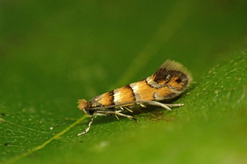 Wingspan 7 to 9 mm. The larva mines the leaves of Alder, creating a tentiform mine between two veins on the underside, with a winkled surface withut sharp folds. The larva is white or yellow, and the pupa is in a cocoon with frass heaped to one side.