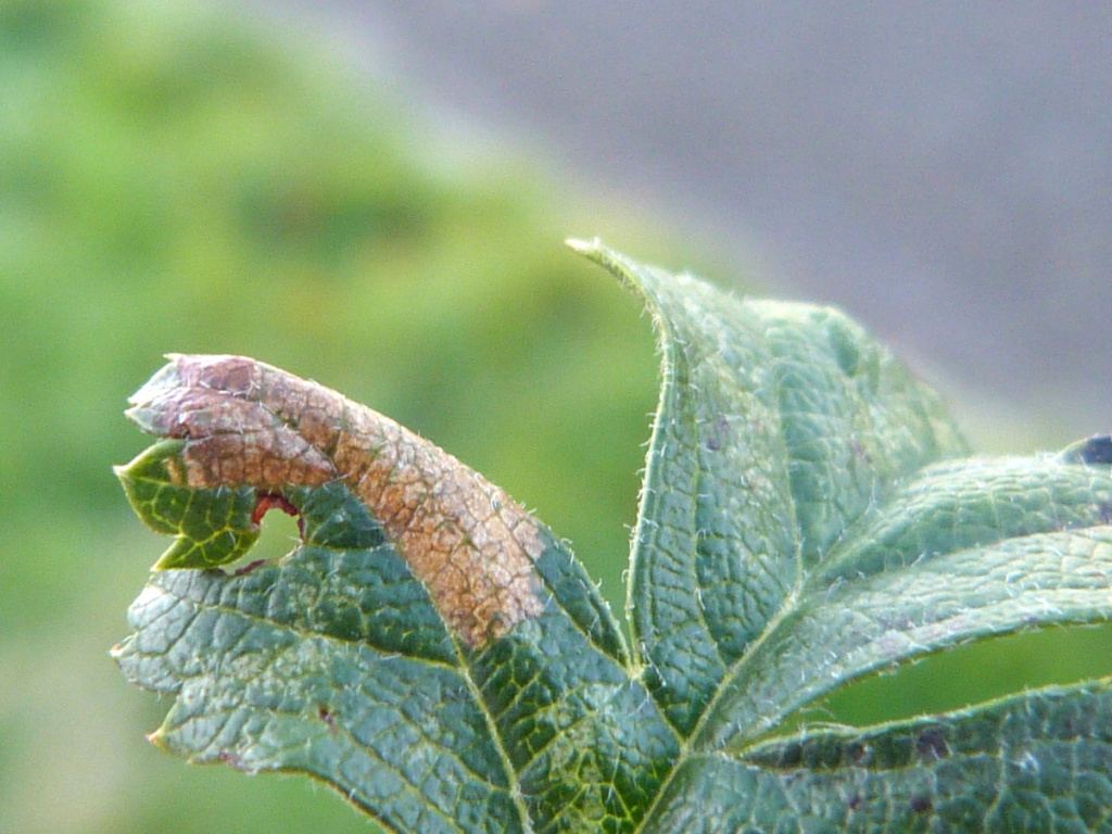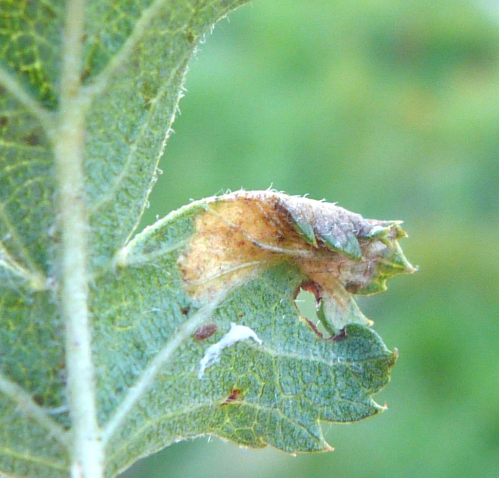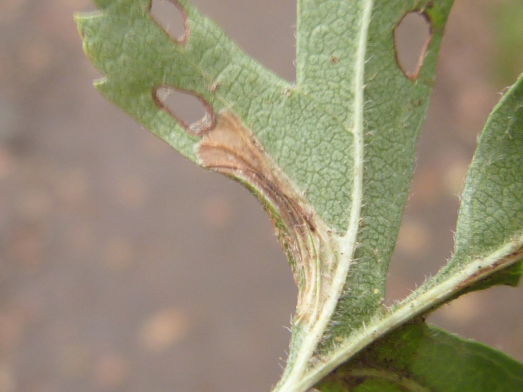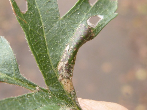 The larval mine is a blotch on the underside of a leaf, often causing the edges of a lobe to curl under.