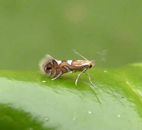 Wingspan 7 to 9 mm. The markings of this species are white, chestnut brown and black. The larva only mines the leaves of Grey Alder (Alnus incana), causing a narrow strongly contracted tube-like mine between two veins.