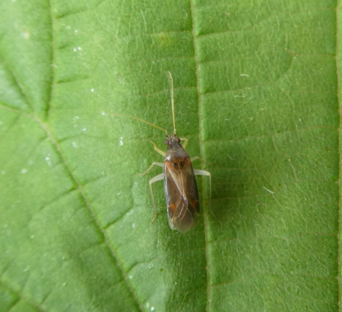 Length 4.5 to 5.5 mm. There are three species of Phylus bugs in the UK, which can be separated with some reliability by the colour of the head and forewings. Host plant is also a useful aid to identification. The forewings of this species vary from light brown to black, with the cuneus usually slightly reddish.