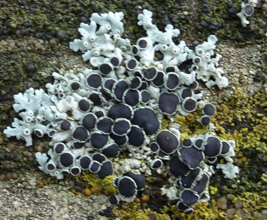Whitish or pale bluish-grey thallus to 6cm diameter. It is distinctive because of its white rimmed apothecia with black centres.