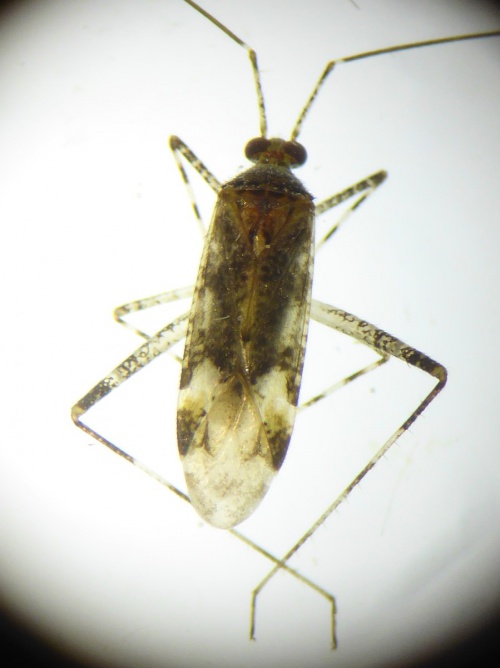 Length about 7 mm. Phytocoris species have a distinctive appearance due to the long hind femora and long 1st antennal segment. In Phytocoris longipennis the distribution of black on the pronotum is not sharply defined and the upperside is diffusely mottled with brown or black. The pale bands on the mid tibiae are wider than the dark bands.