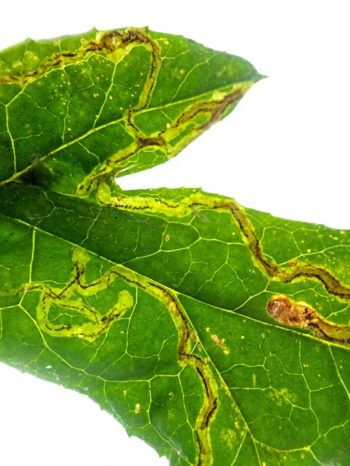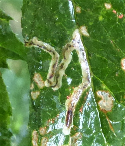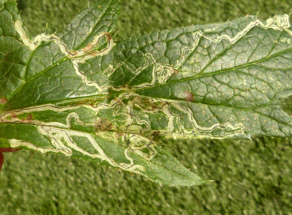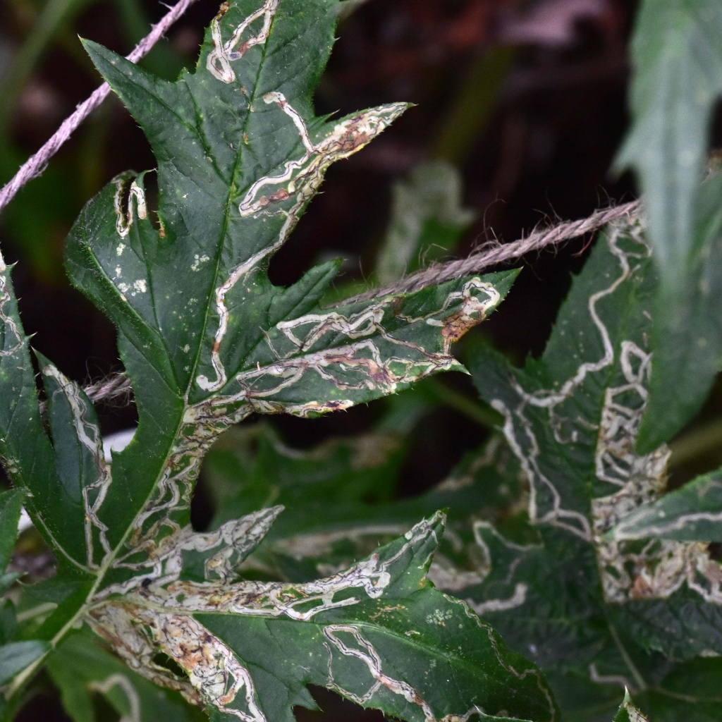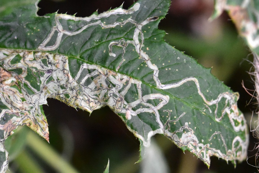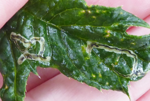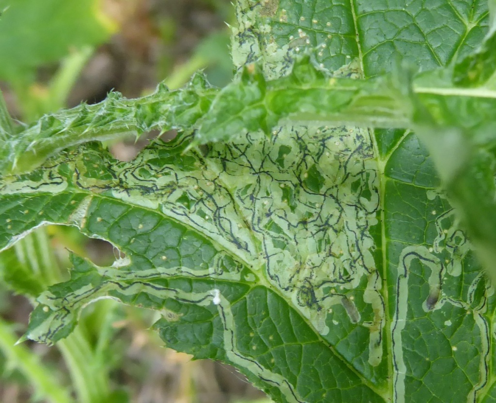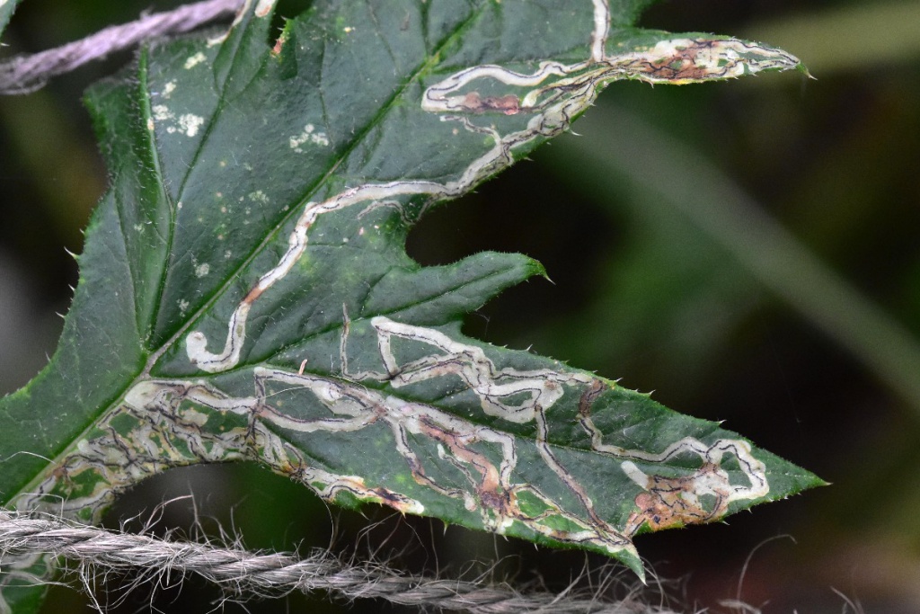 The larvae of the fly Phytomyza bipunctata mine the leaves of Echinops species (Globe Thistles). The long, white mines have frass in long strips on alternate sides of the gallery.