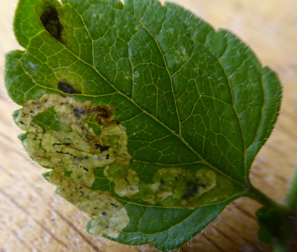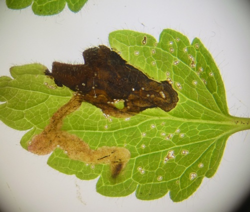 Provide backlit photographs of the whole leaf-mine in the leaf, and the larva, and note the host plant.