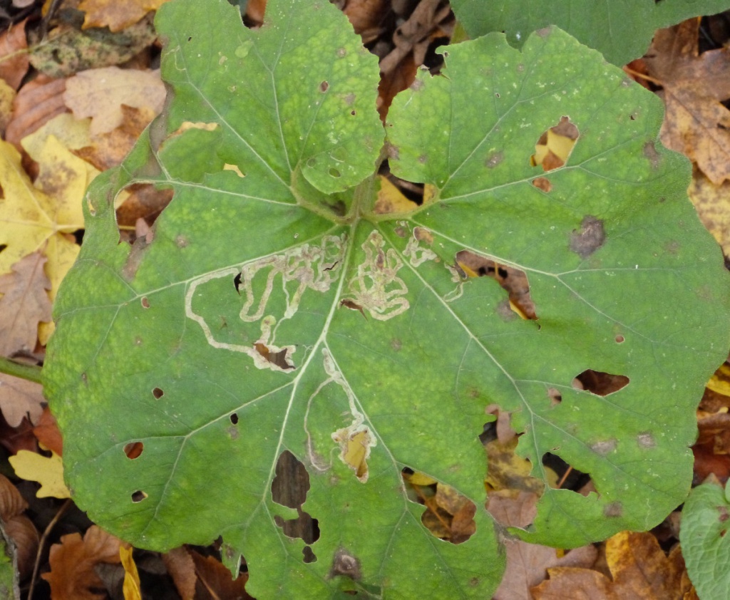 The larva of the fly Phytomyza tussilaginis mines the leaves of Butterbur, Colt’s-foot and Winter Heliotrope, producing a long narrow mine, widening at the end and often forming a secondary blotch.