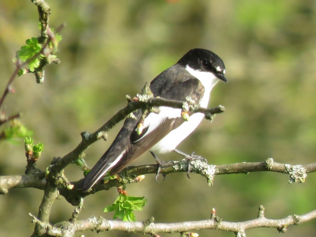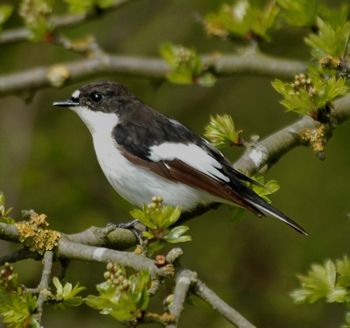 The breeding male Pied Flycatcher is easily identified with his bright, white underparts, black and white wings and little white spot on his forehead. In all other plumages they are duller, not so clean below and with brown not black upperparts. They can easily be told from Spotted Flycatchers by the white markings which go down as well as across the wing. Their habit of letting the wings droop below the level of the tail is typical of the Flycatchers. In female, or non-breeding plumages, they can be hard to distinguish from the other Ficedula Flycatchers but notice that the white at the base of the primaries and the pale second wing bar (on the median coverts) are either very small or lacking completely.