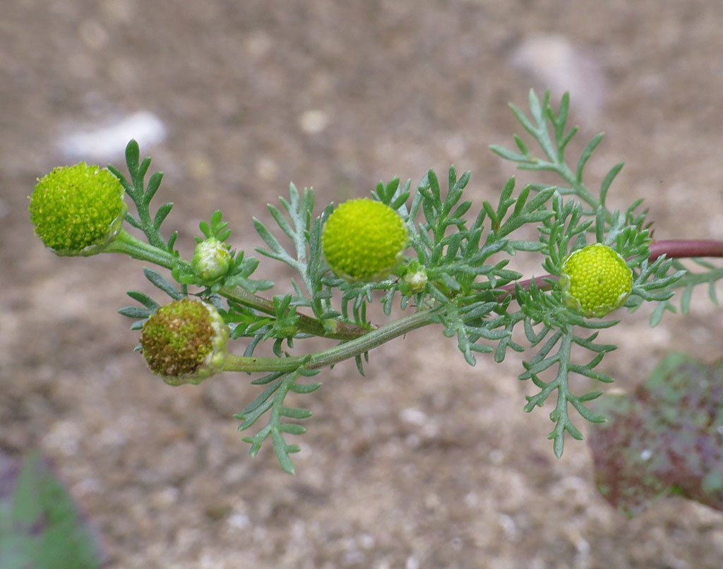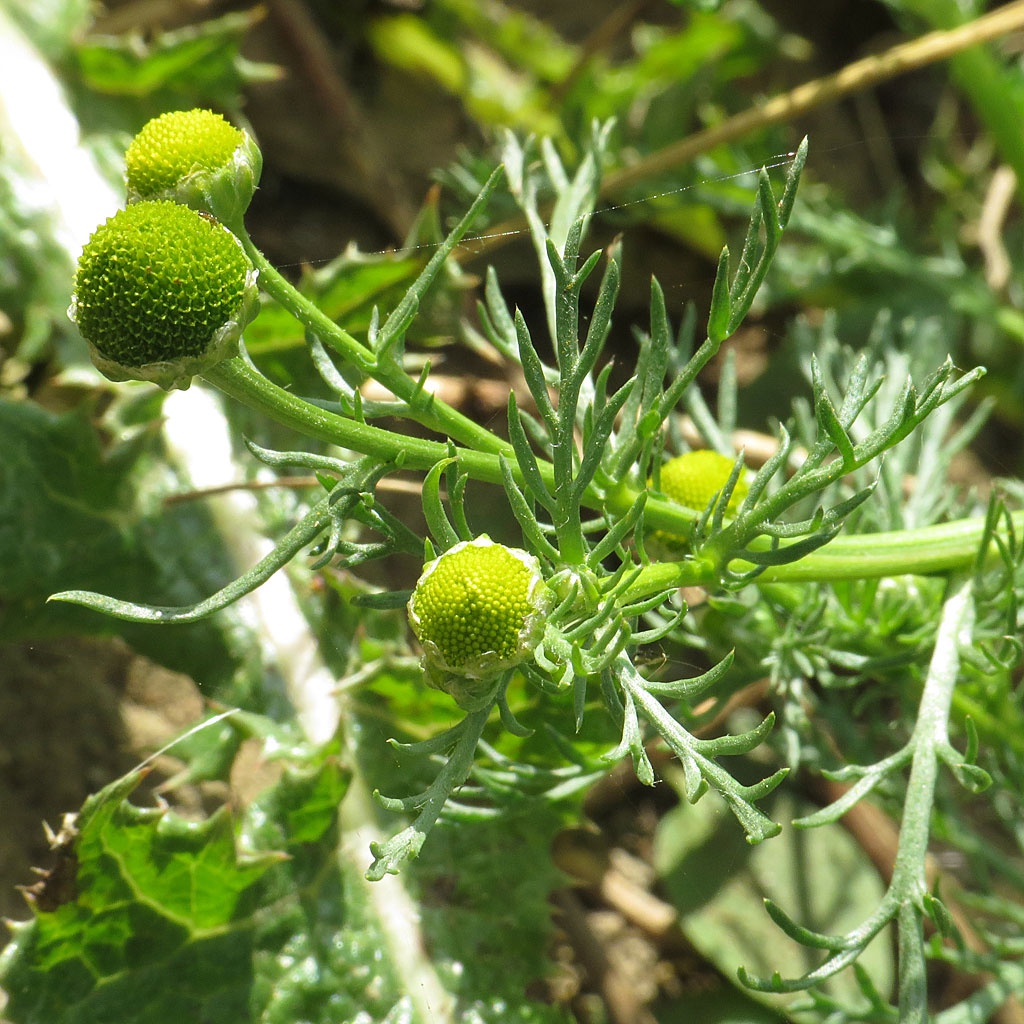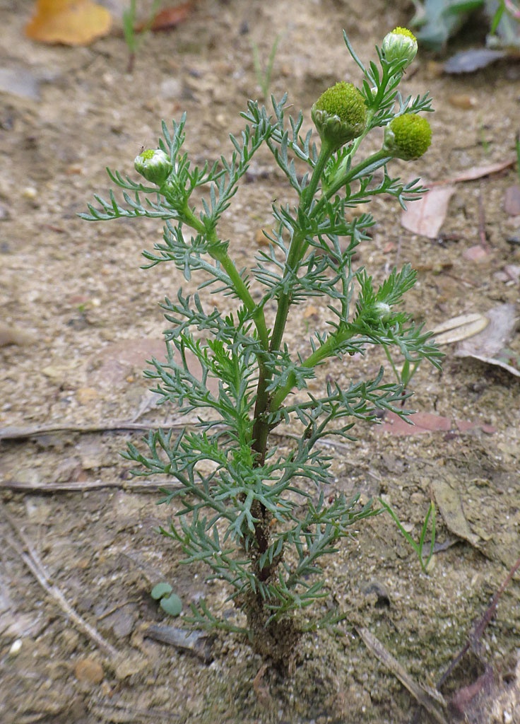 Low to short hairless plant, pineapple scented when crushed. Stems well branched, erect, leaves feathery. Flowerheads yellowish green, rayless 5 to 8 mm with a conical disk, solitary on short stalks.