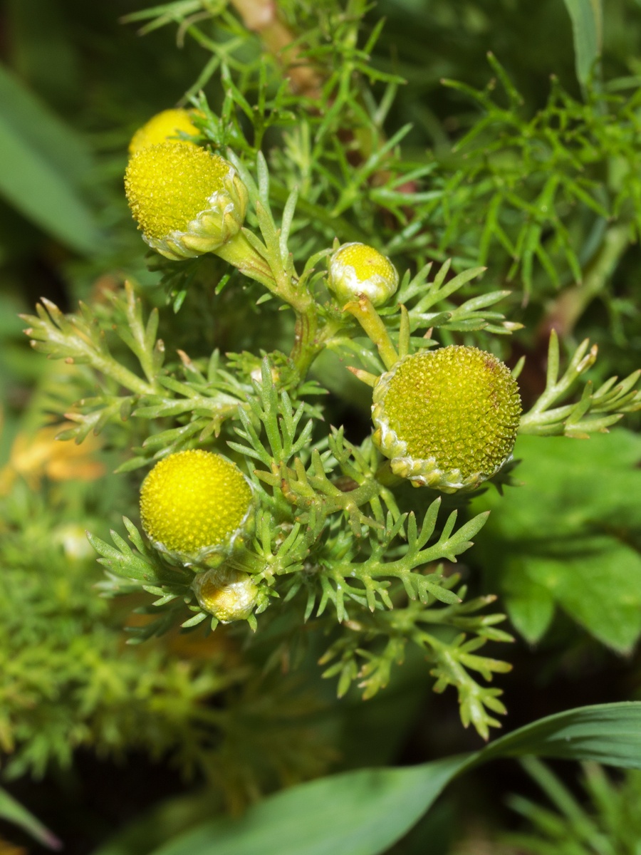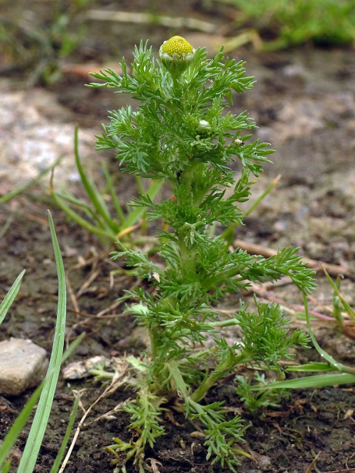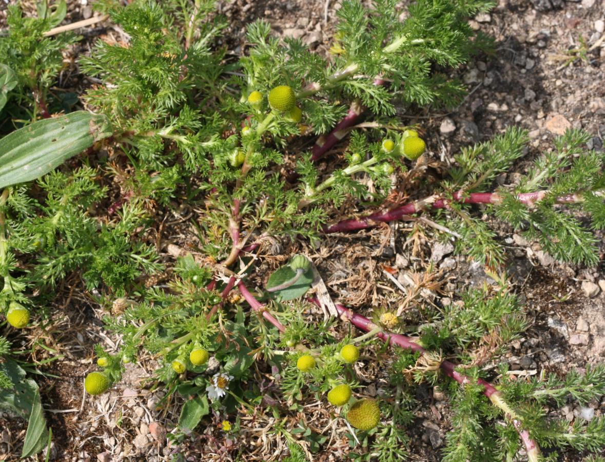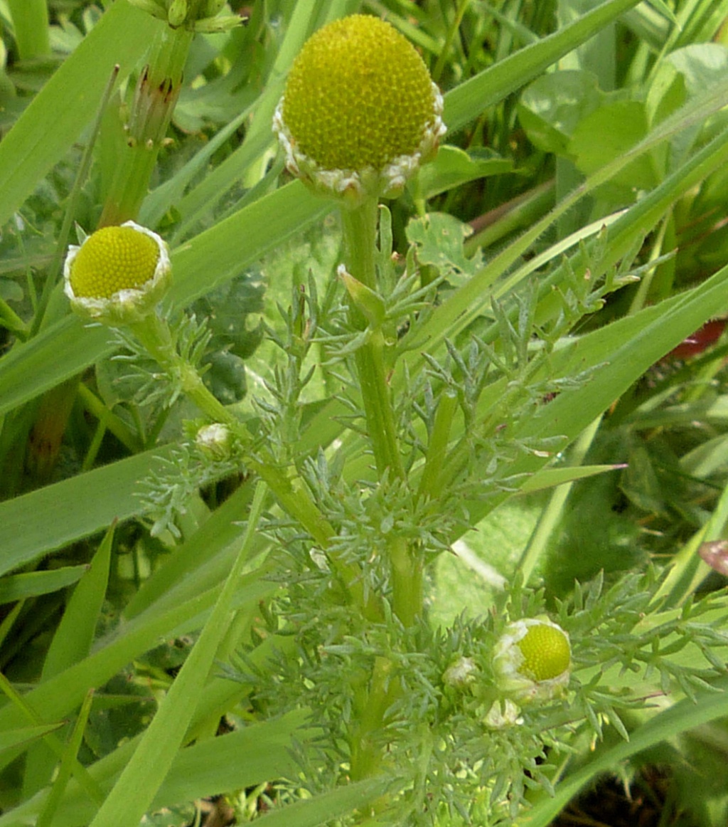 Low to short hairless plant, pineapple scented when crushed. Stems well branched, erect, leaves feathery. Flowerheads yellowish green, rayless 5 to 8 mm with a conical disk, solitary on short stalks.
