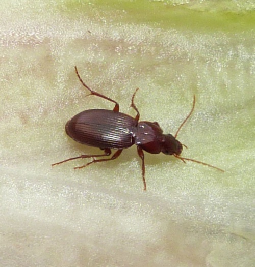 Length 5.5 to 8 mm. A narrow and elongate ground beetle, it is dorsally flat and varies in colour from a very dark red/brown to light red brown.