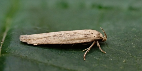 Wingspan 16 to18 mm. Although a rather plain looking pale brown species, this moth can be recognised by the blackish spot at the very base of the forewing, and the small black dot close to the centre of the wing, ringed paler.