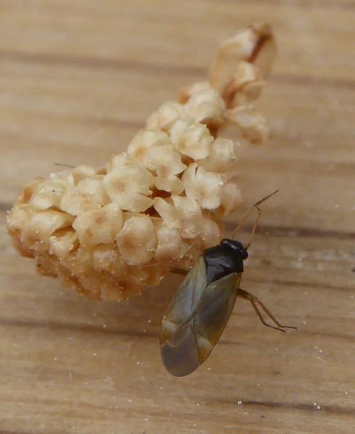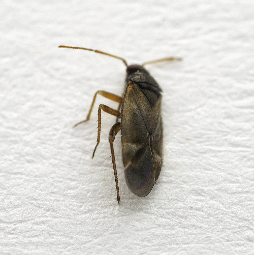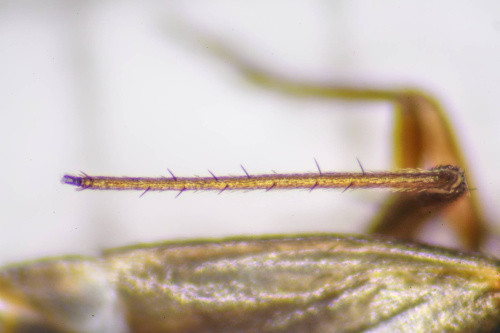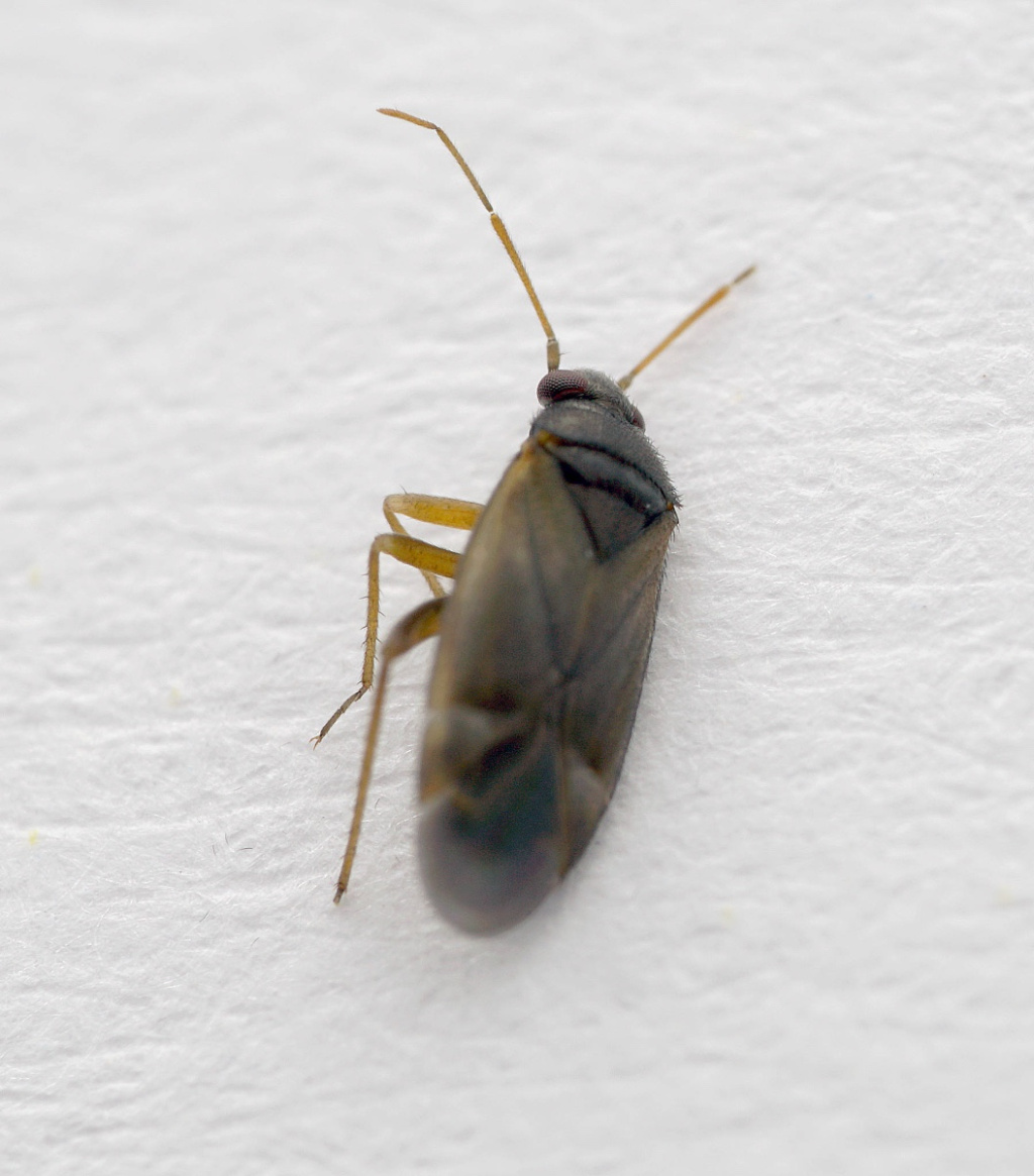 A small (length around 3 mm) dark bug which lacks pale hairs on the upper surface. The foreparts are often darker than the corium and the base of the cuneus is pale. The tibial spines are shorter than the width of the tibiae and are not set in black spots.