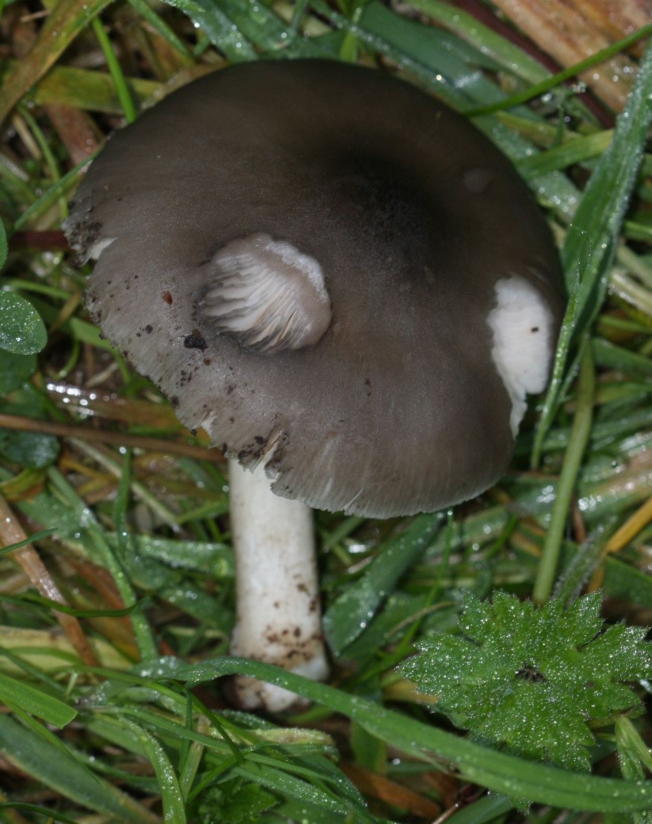 The cap is grey-brown to dark grey and innately fibrillose, convex at first, becoming flatter with age, and with an umbo. The gills are numerous, whitish at first but maturing pinkish-brown.  The stem is whitish with darker fibrils.