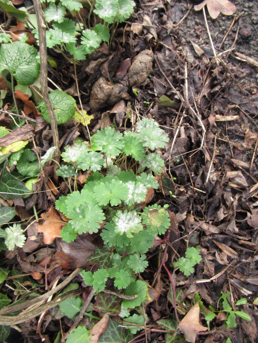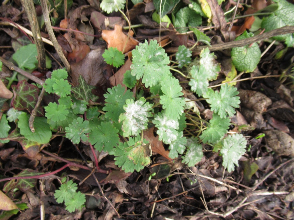 A powdery mildew affecting some cranesbills (Geranium species).