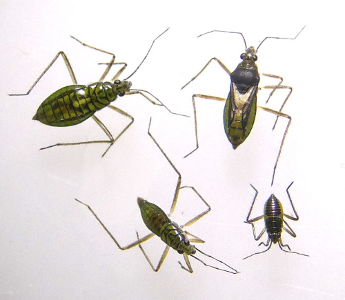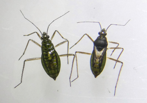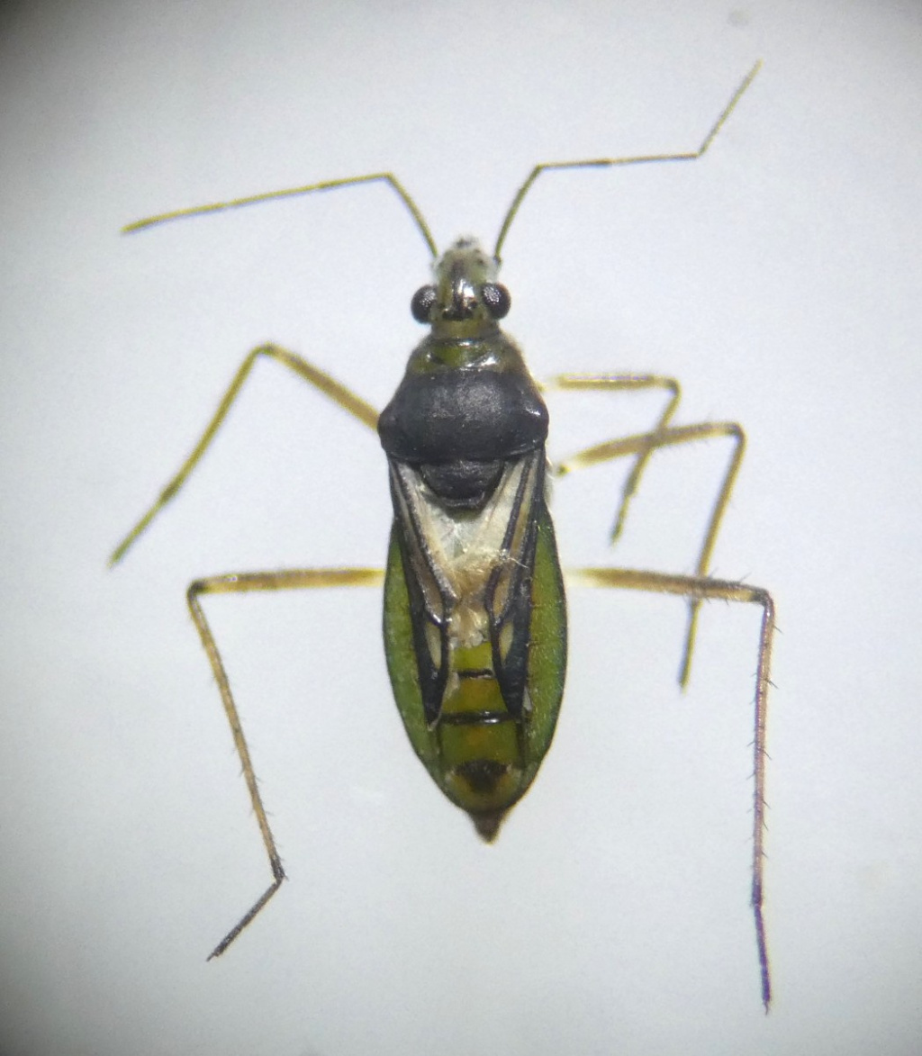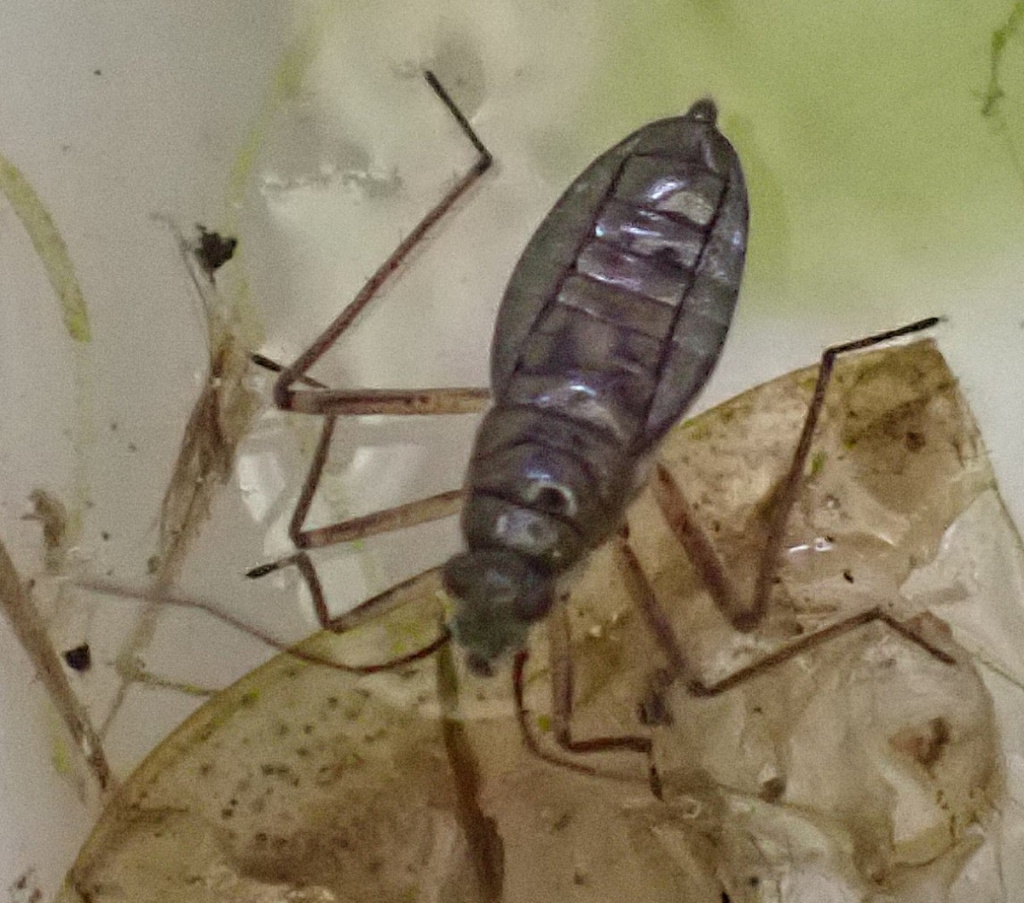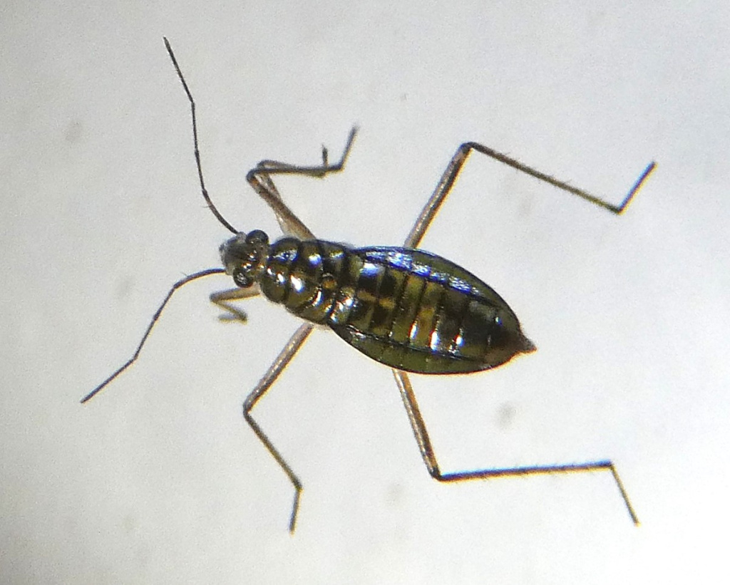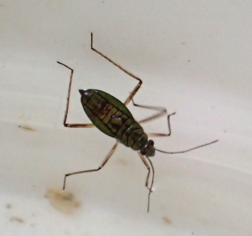 This is a small bug (about 3 mm) in a family group known as water treaders. Mesovelia furcata has a greenish colour and rather slim shape. It is usually wingless but winged forms do occur and these may fly to colonise new areas.