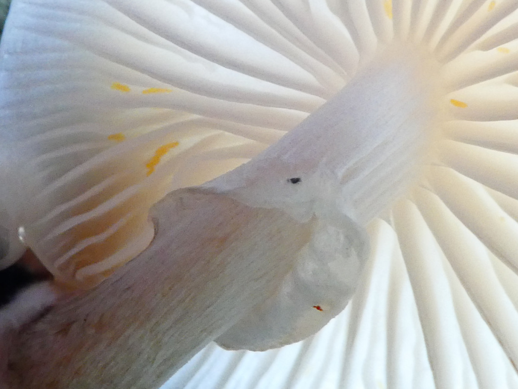 The caps are grey when young, becoming white and translucent as they mature, and are very sticky and glutinous. The gills and upper part of the stipe abve the thin membraneous ring are also white.