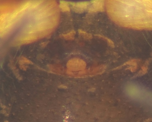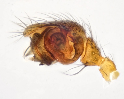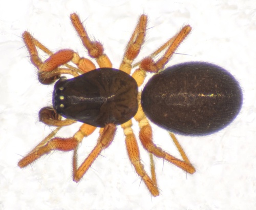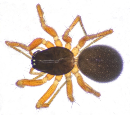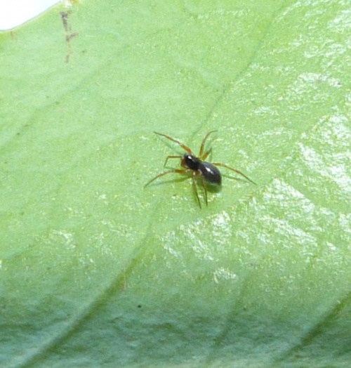 Length 2 or 3 mm. This is a small dark blackish spider with paler legs.