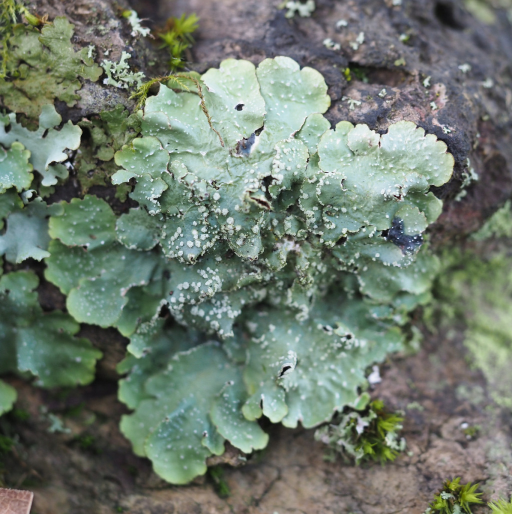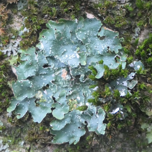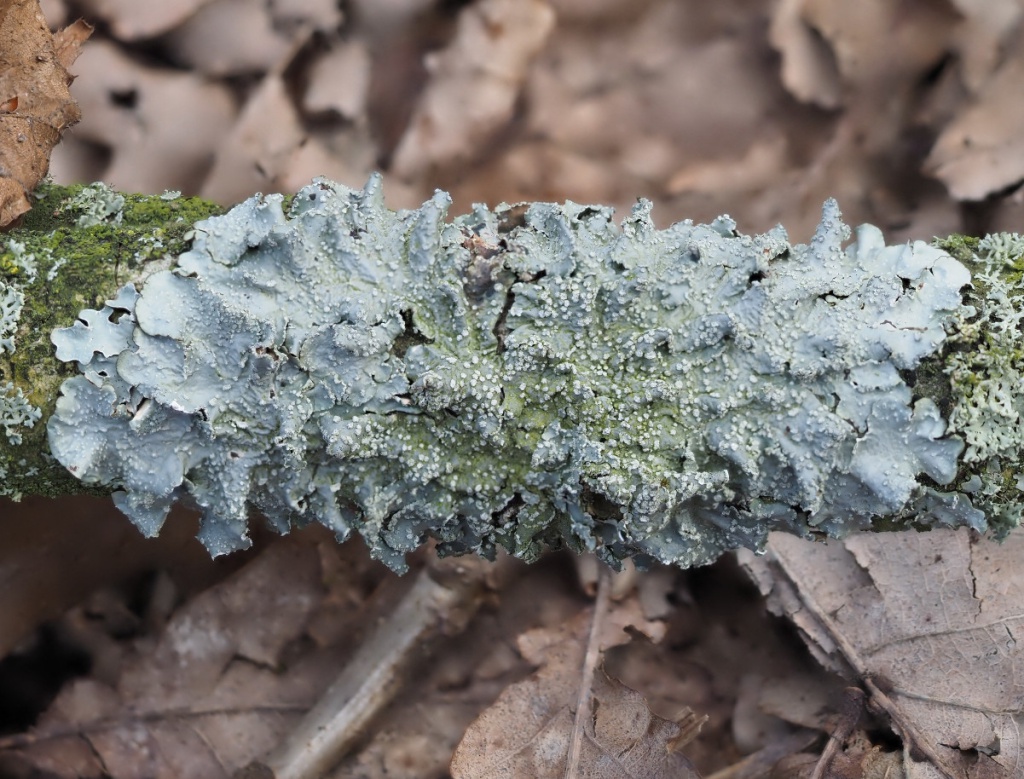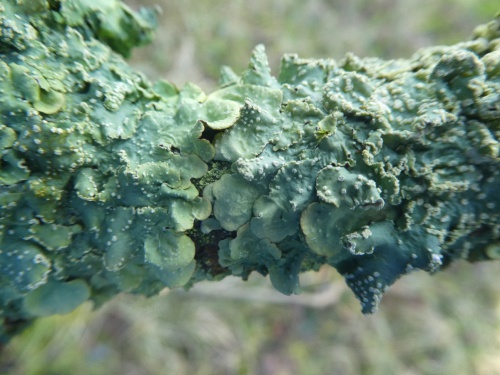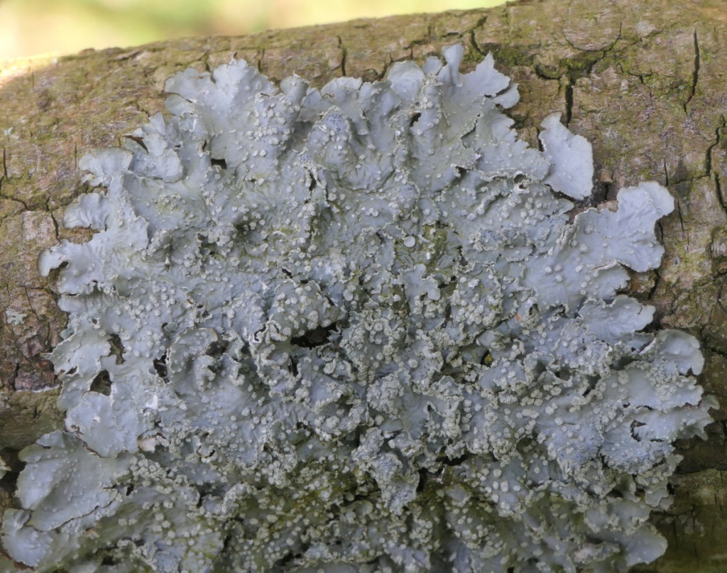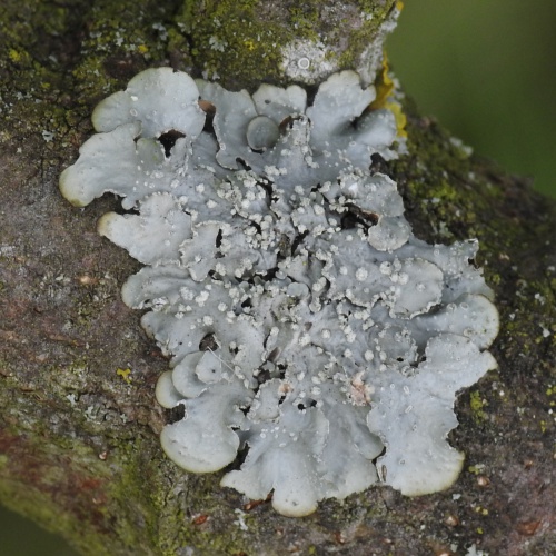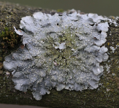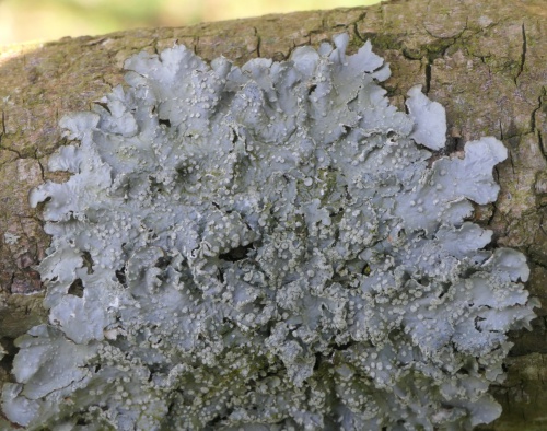 This is a grey, leafy lichen which grows to around 7cm. It can appear much greener when wet. The smooth lobes are about 1cm wide and studded with white dots (punctiform soralia).