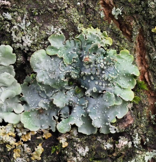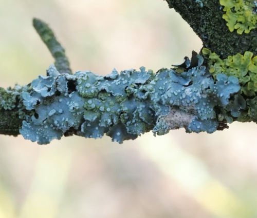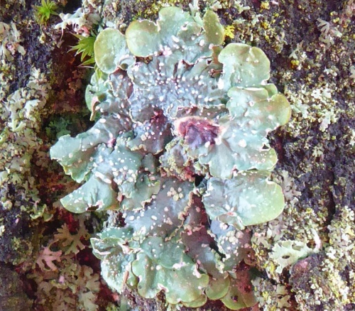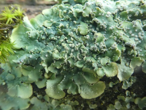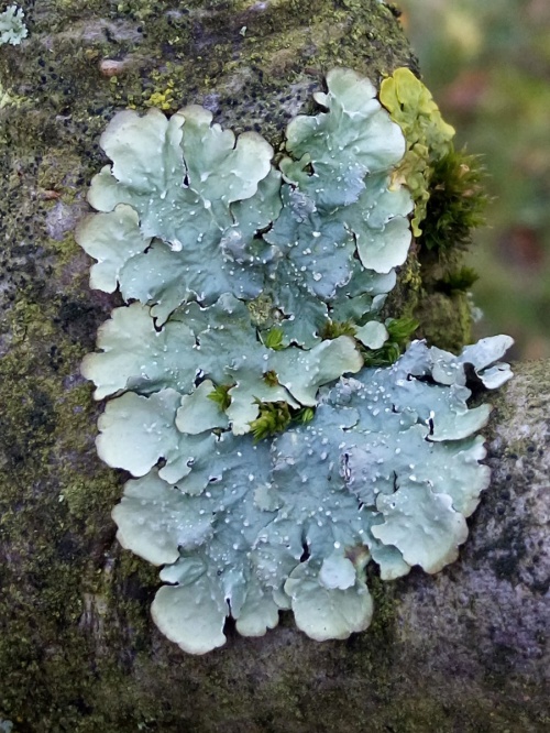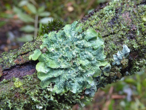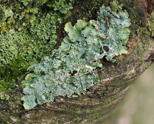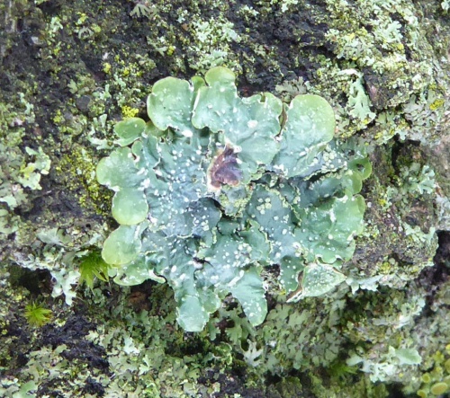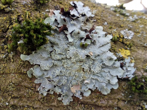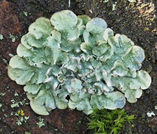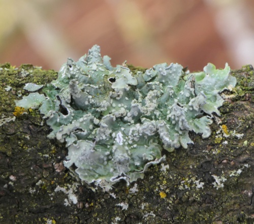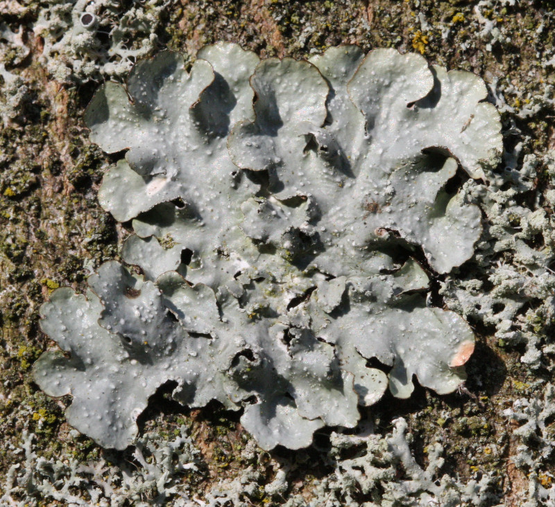 This is a grey, leafy lichen which grows to around 7cm. It can appear much greener when wet. The smooth lobes are about 1cm wide and studded with white dots (punctiform soralia).