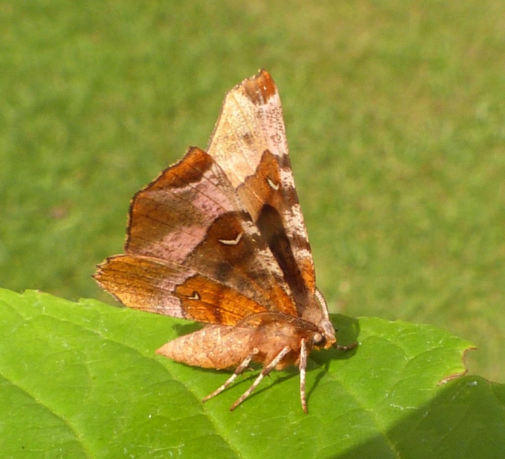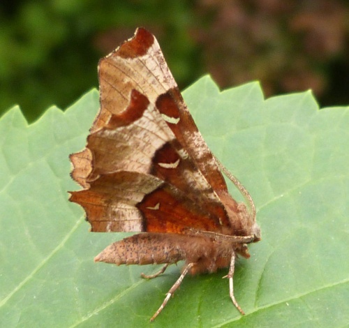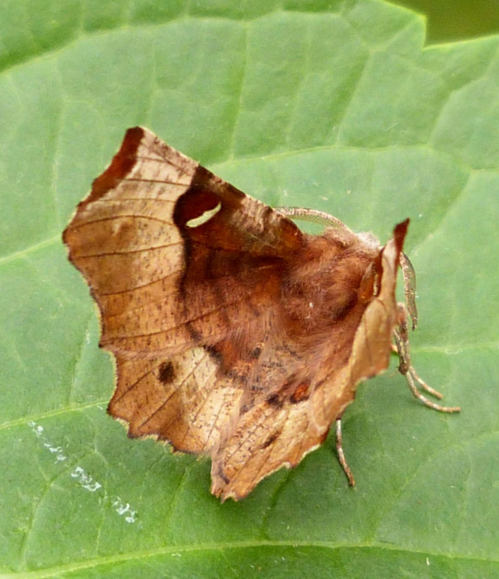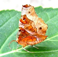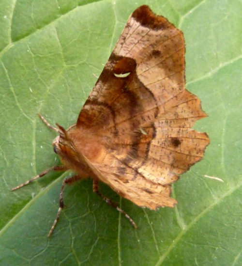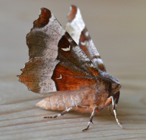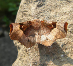Wingspan 30-38 mm. The silvery crescent on purplish brown forewing is larger than on Lunar Thorn and it has a dark central spot towards outer edge of hindwing upperside. The late summer moths are paler.