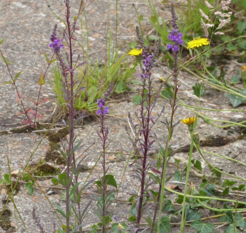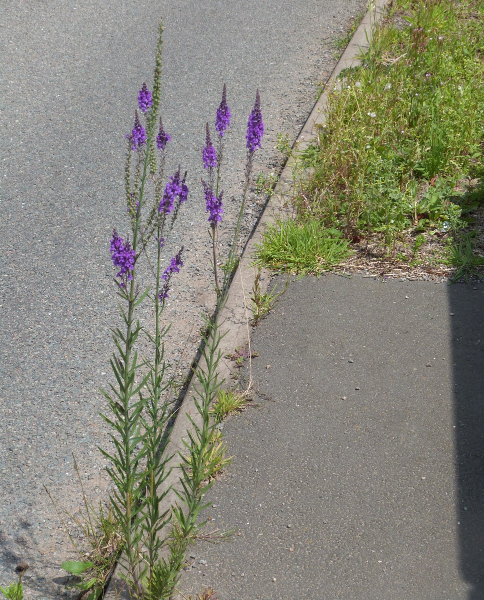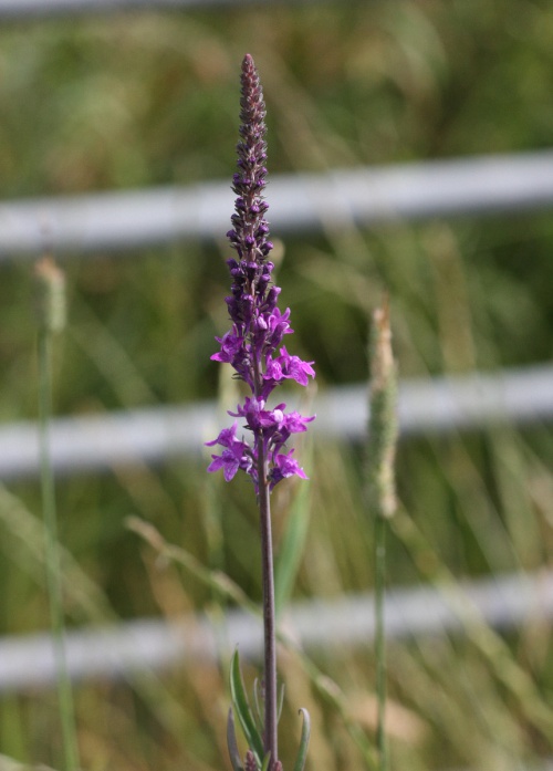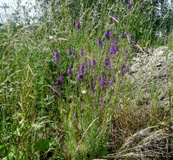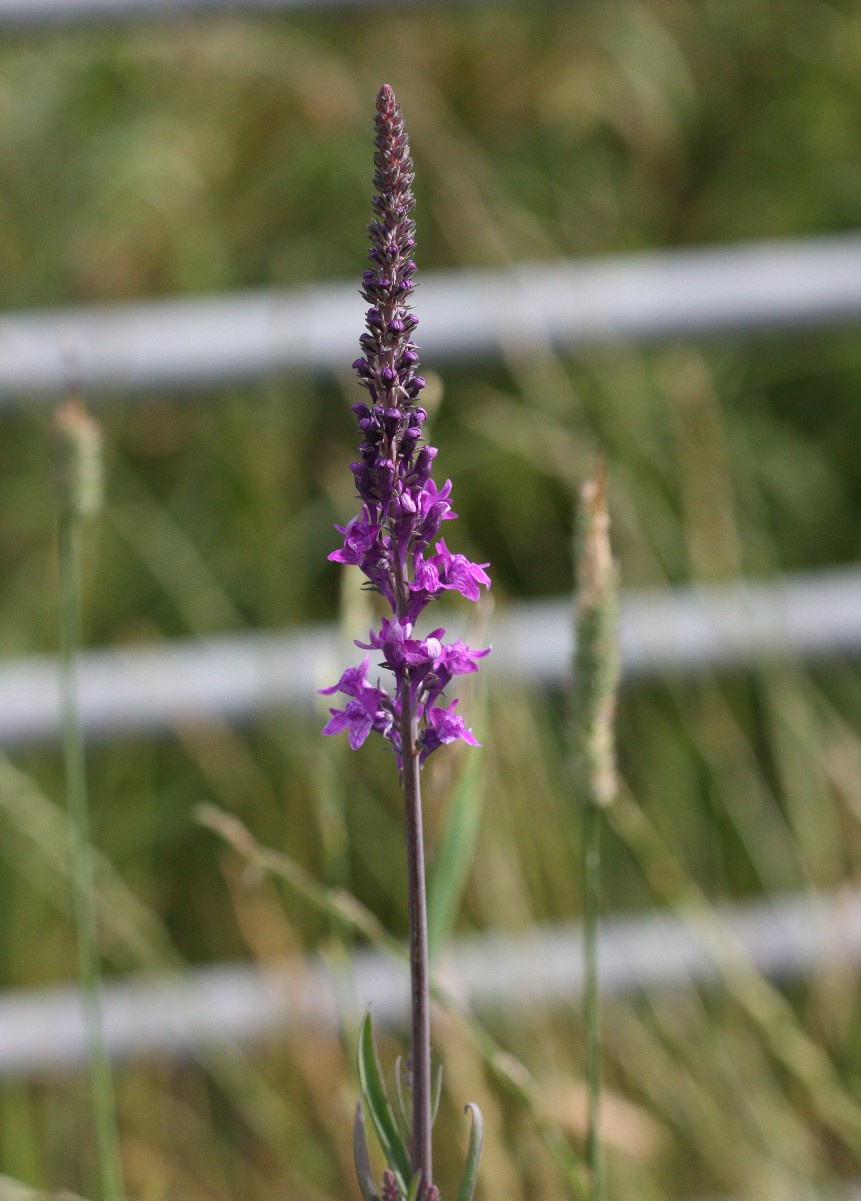Medium height, tufted, hairless plant, stems erect to ascending, often branched above. Leaves linear, numerous, the lower whorled. Flowers purple or purplish violet 9 to 12 mm, in long, rather dense tapered racemes, the spur 5 mm long and curved.