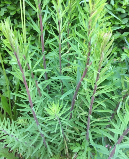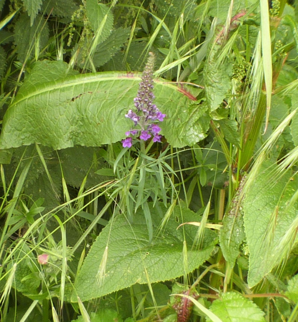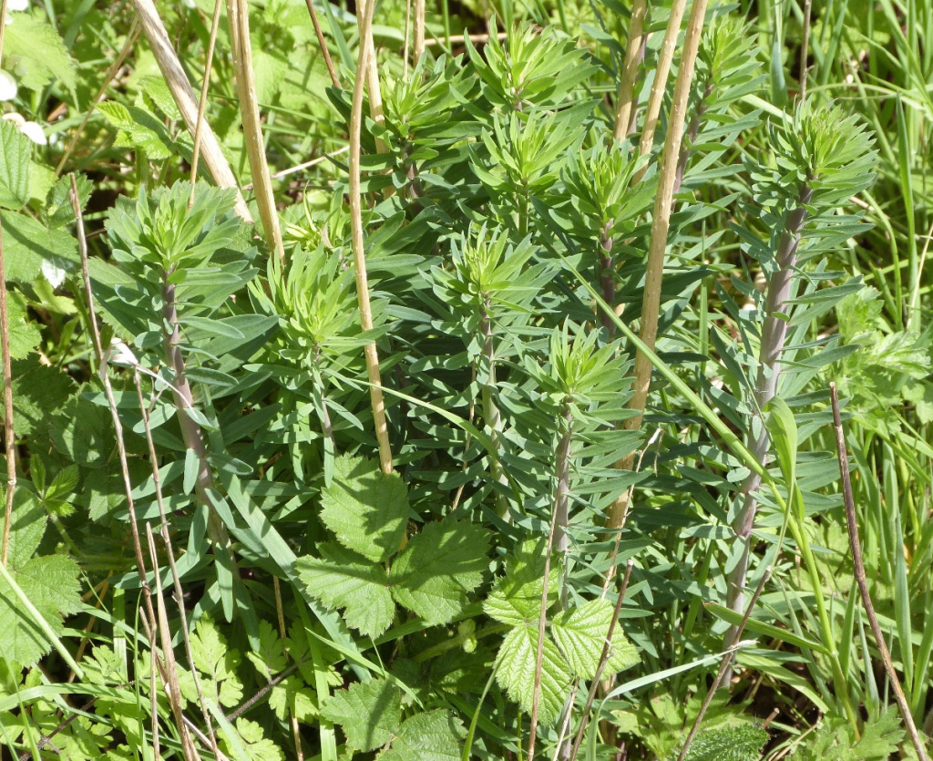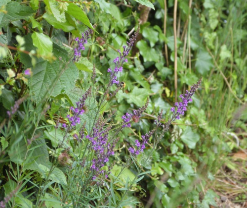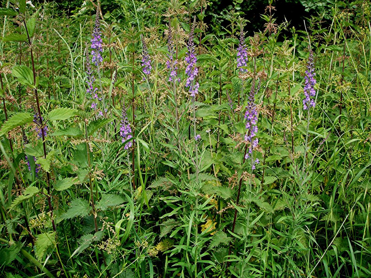 Medium height, tufted, hairless plant, stems erect to ascending, often branched above. Leaves linear, numerous, the lower whorled. Flowers purple or purplish violet 9 to 12 mm, in long, rather dense tapered racemes, the spur 5 mm long and curved.