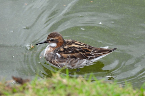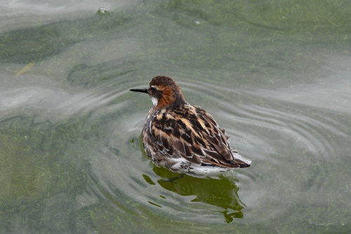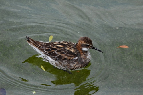 Phalaropes are the only waders which habitually swim on water, feeding by stirring as they move, then reaching to pick insects from the surface. Compared to its relative, the Grey Phalarope, this species is smaller and slimmer with a longer, finer, more needle-like bill and, in most plumages a bolder pattern on its back. The juvenile bird has two obvious pale lines down either side of its back which distinguishes it from the Grey Phalarope. In summer plumage both species show conspicuous red in their underparts but in the Red-necked Phalarope this is limited to a band around most of the neck. Incidentally, this is bolder and brighter in the female