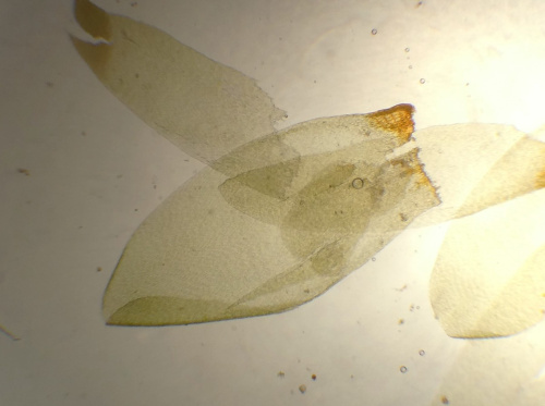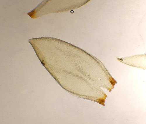 The loosely pinnate branches and bright red stem showing through translucent green leaves are usually easy to recognize. When dry, the red stems only become visible on wetting, or after scraping leaves off the stem. Shoots are several centimetres long. The leaves, about 2 to 2.5 mm long, are oval with a broad, blunt tip; they are also very concave and envelope the stem. Stem and branch leaves are similar in shape, but the branch leaves are rather smaller. The leaf has a short, double nerve (but this may be absent) and thick-walled, orange-brown cells in the basal corners. Capsules are rare in this species.
