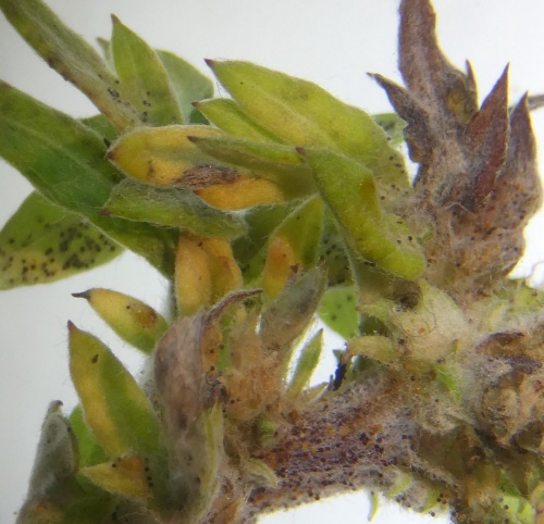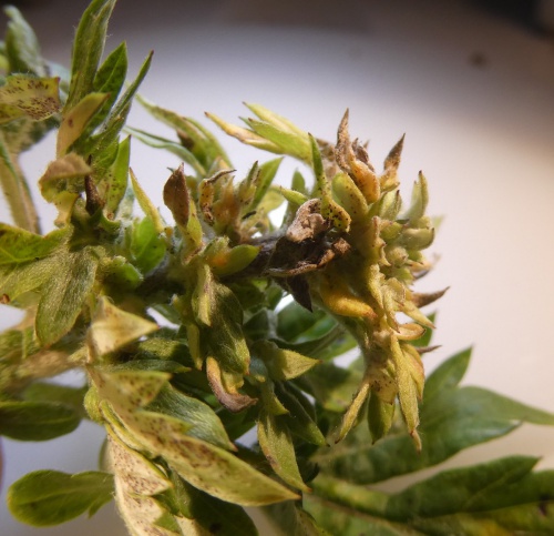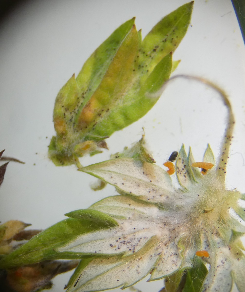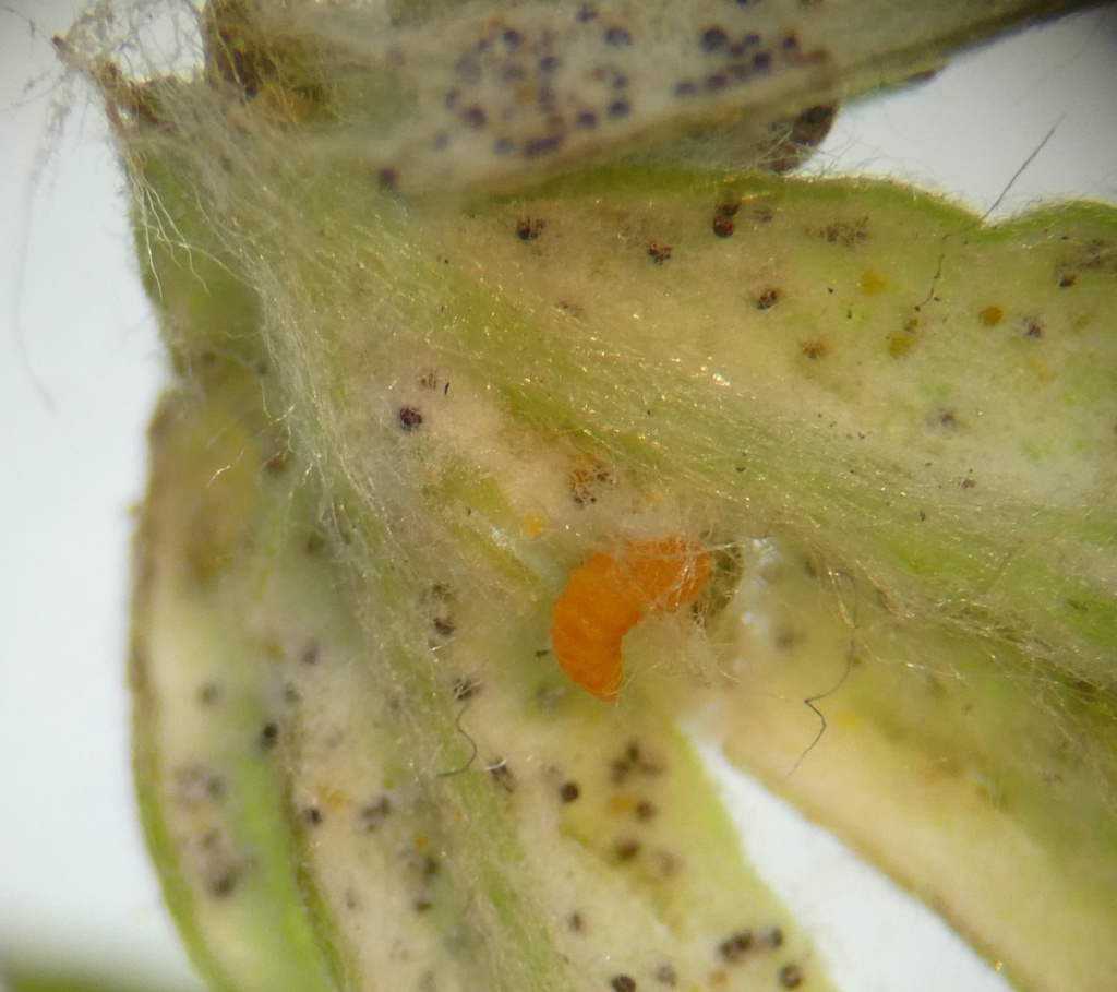 The larvae of the midge Rhopalomyia foliorum cause small oval galls, about 2 mm long, first on the stem or leaf of Artemisia (Mugwort) and then generally at the upperside of a thick vein. Eventually the plant may become distorted with leaves bunching. Larva is orange.