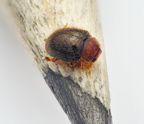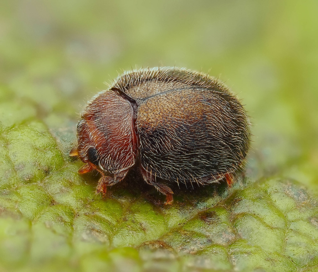 Rhyzobius lophanthae is a small ladybird with a length between 1.7 and 2.8 mm. The head and prothorax are dull orange or reddish-brown, as are the legs and underside. The elytra (wing cases) are dark with a metallic bronze sheen. The entire dorsal surface is covered densely with short, pale hairs interspersed with longer, darker bristles, a trait that gives it the common name, Bristly Ladybird.