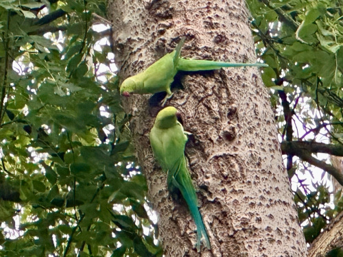 The UK's only naturalised parrot - it is large, long-tailed and green with a red beak. In flight it has pointed wings, a long tail and very steady, direct flight. The male has a distinctive pink and black ring around its face and neck, but the species is sexually dimorphic and the hen and immature birds of both sexes either show no neck rings, or display shadow-like pale to dark grey neck rings.