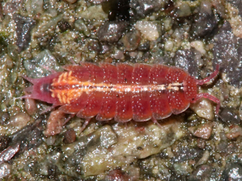 The Rosy Woodlouse is small and only 6 mm long It is characteristically pink or orange in colour, with a yellow stripe along the midline of the dorsal surface, which divides in two towards the animal's tail. It has large eyes for its size and a granular exoskeleton.