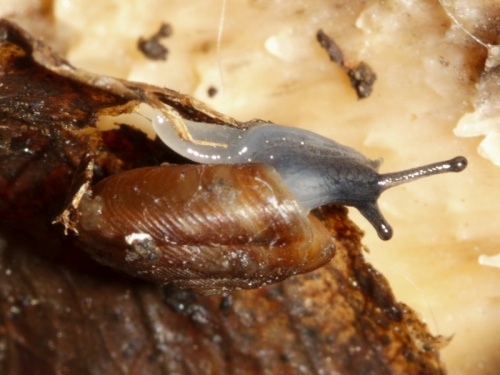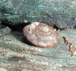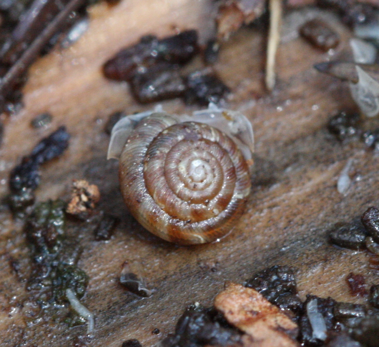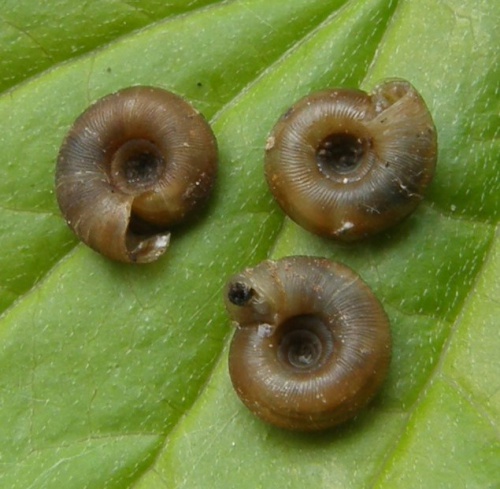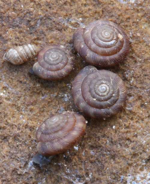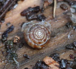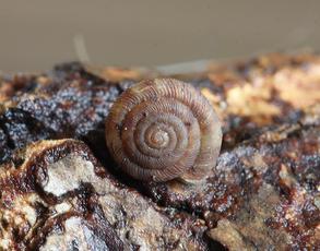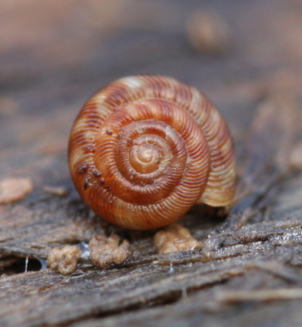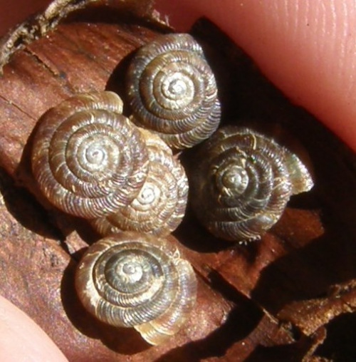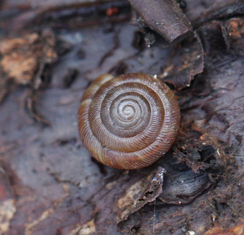 The Discus Snail is a fairly small snail (5 to 7 mm) with a flattened, almost lens-shaped, tightly coiled and densely ribbed, brownish yellow-grey shell which, on close examination, can be seen to be flecked with red and has 6 or 7 whorls.
