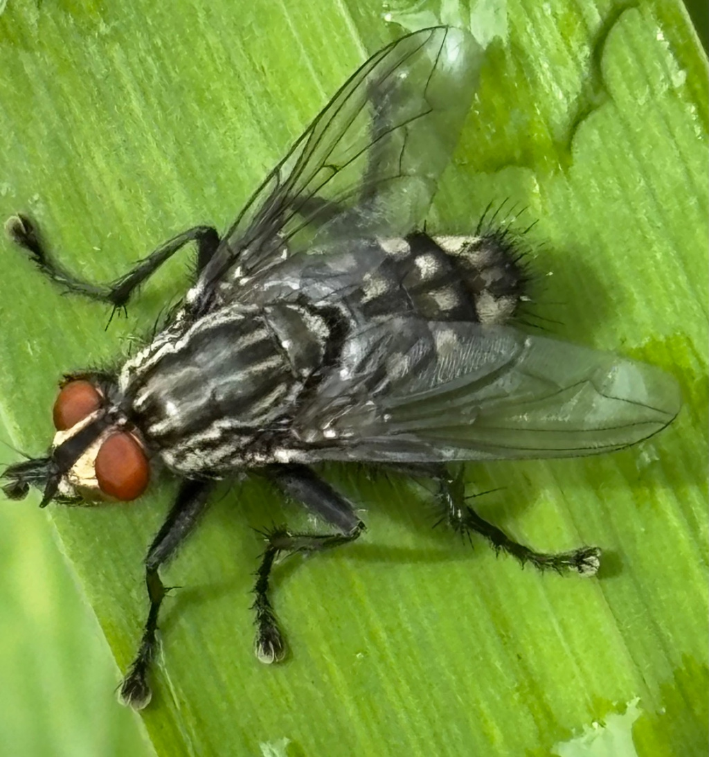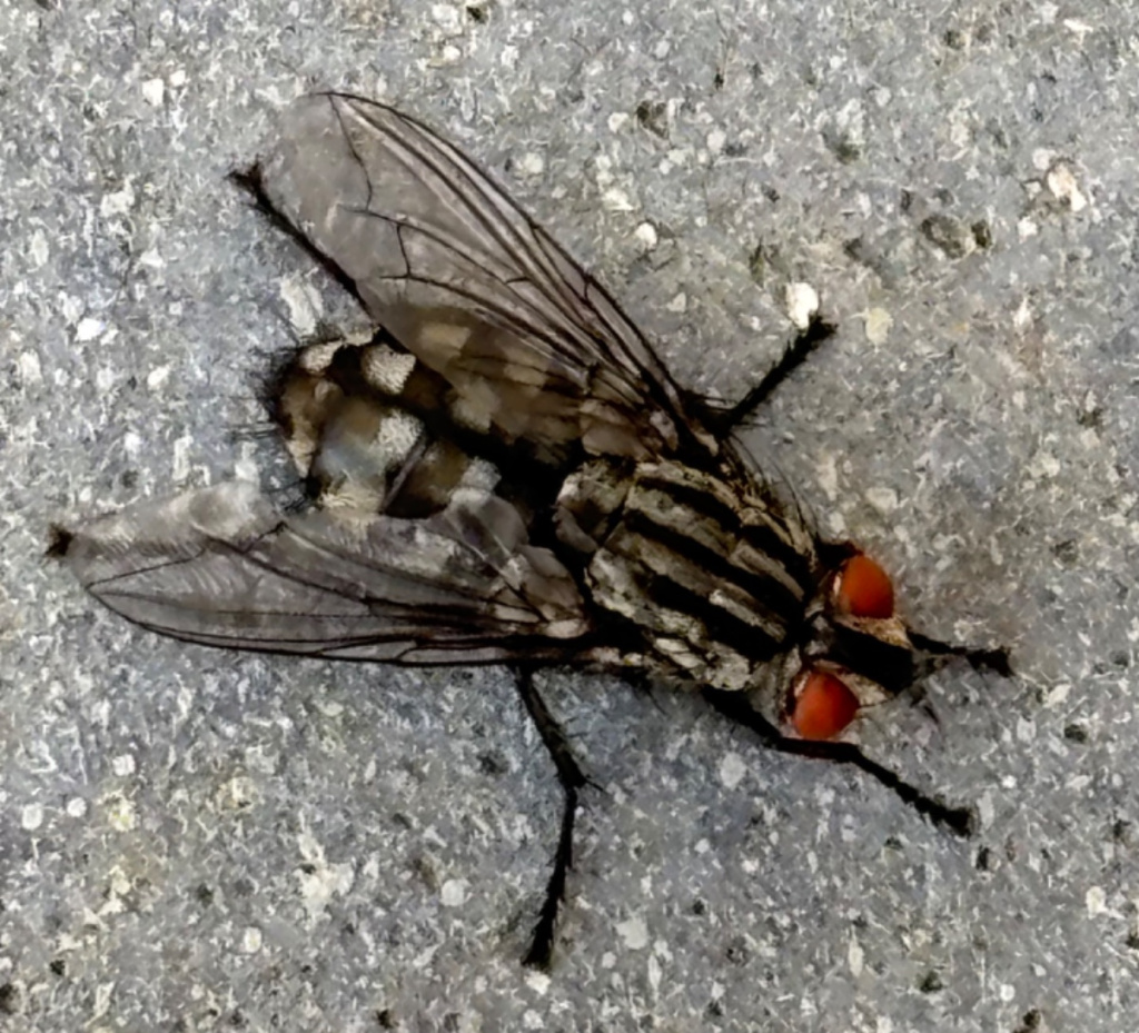 Known as Flesh Flies, these are large flies, usually with a chequered grey and white abdomen and often with large red eyes. It is almost impossible to tell the species apart from their outward appearance and many can only be reliably identified by microscopic examination of the male's genitalia.