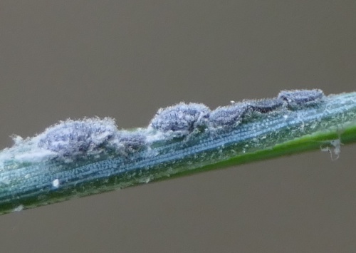 The apterae are dark greyish-green covered in wax meal giving a light bluish-grey appearance. The last rostral segment is very short and stumpy with a short tip. The body length is 1.2 to 2.5 mm.