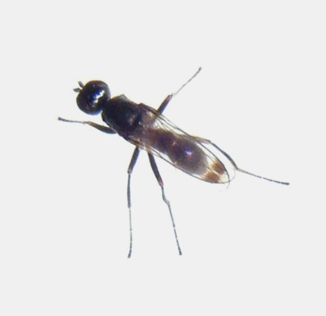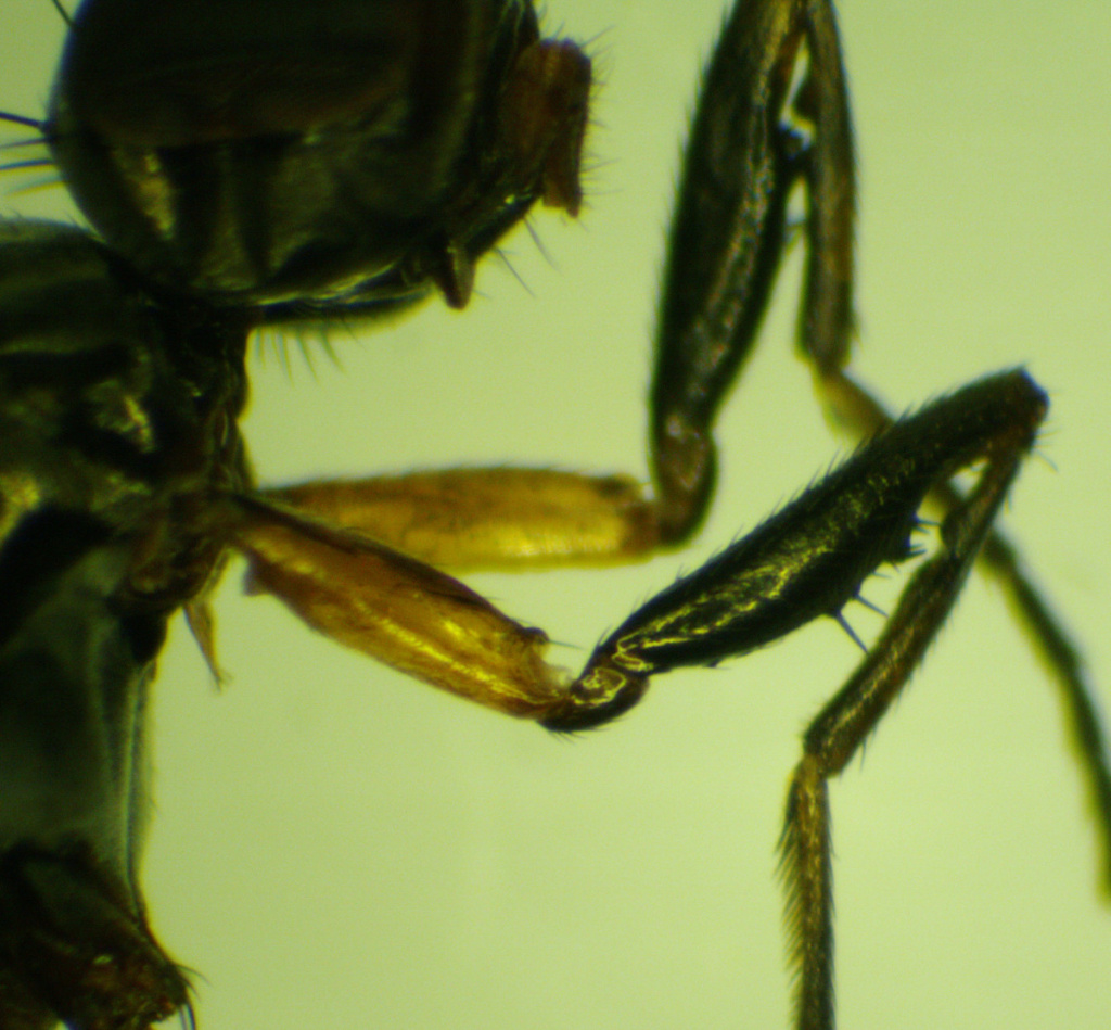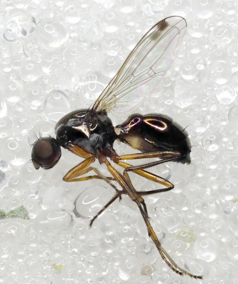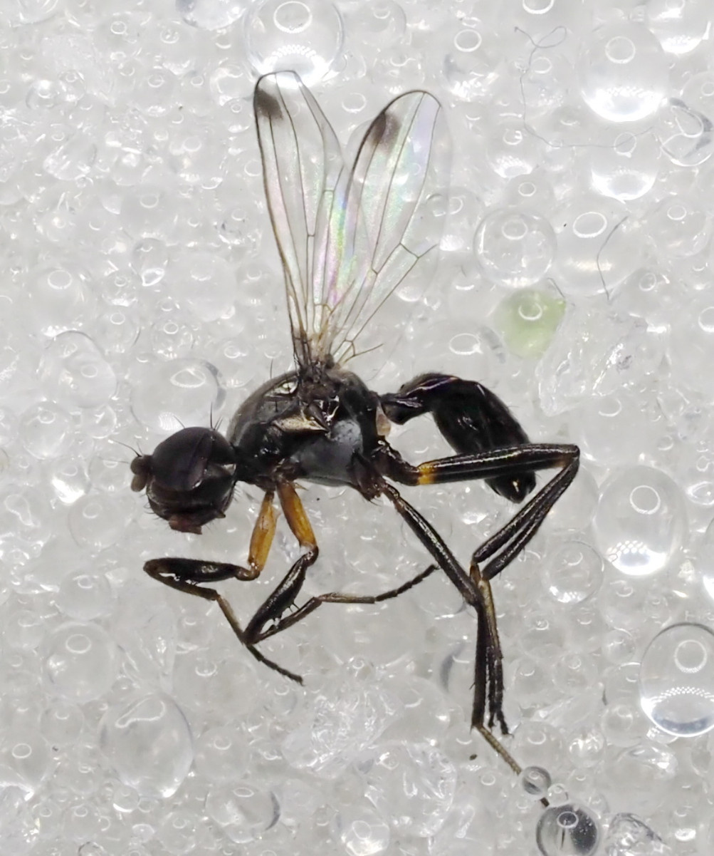 2.5 to 3 mm long. There is a dark wing spot on each wing, typical of the Sepsis genus. The hypopleuron (between the haltere and the hind coxa) is pruinose in the anterior part but glossy black on the posterior part. The sternopleuron is entirely pruinose. (Adjust the angle of light to view the pruinosity). The mid femur lacks an anterior seta near the middle (don't confuse with a ventral or anterior-ventral setae) and the mid tibia has 0-1 posterior setae.