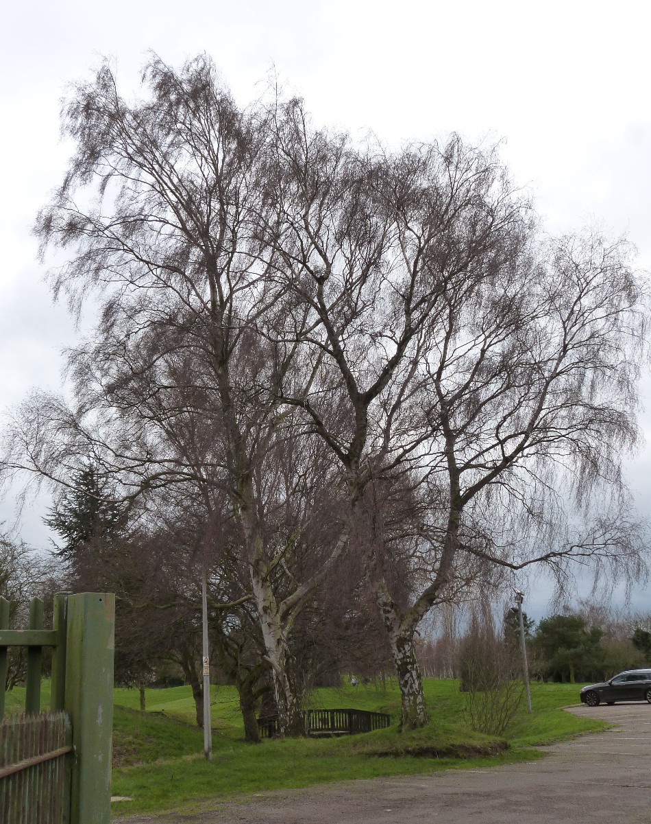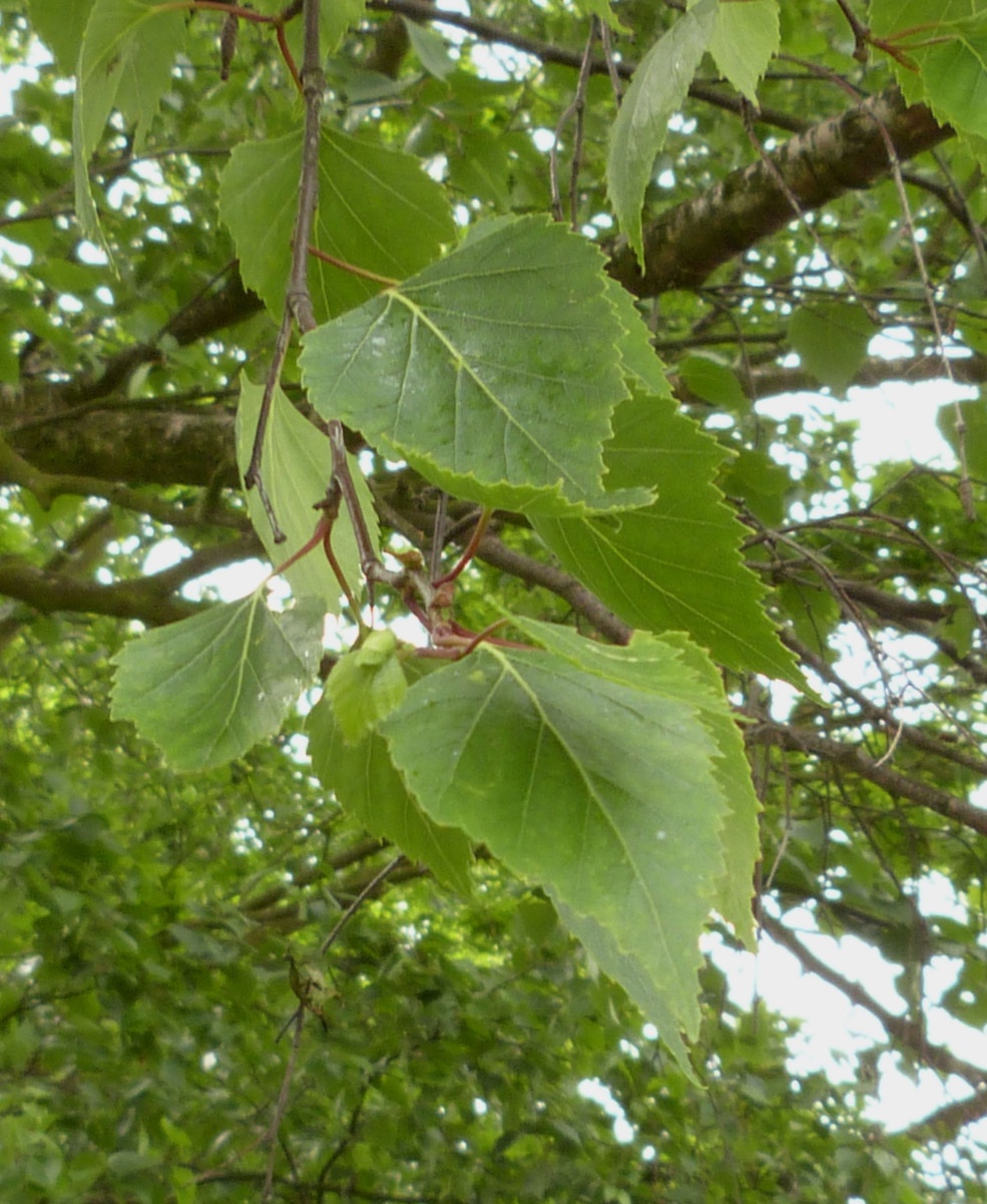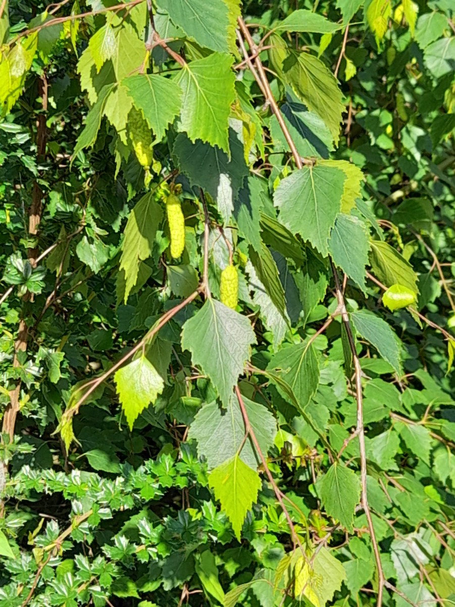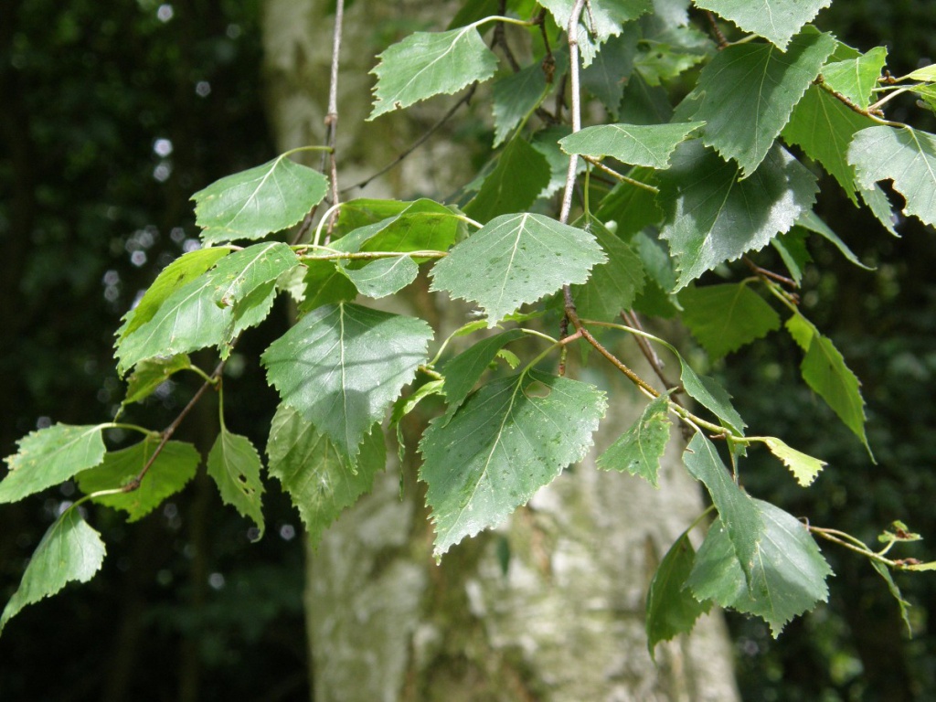 Leaves triangular and irregularly toothed, bi-serrate, with acuminate tips; glabrous when mature. Glabrous twigs, often with prominent paler warts - but note that young saplings and re-growth can have hairy twigs and leaves; in these case the leaf-shape should help to distinguish from Downy Birch.