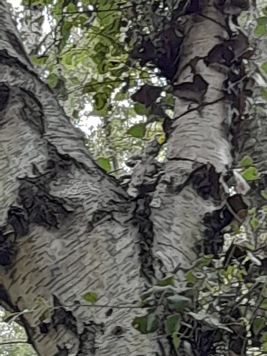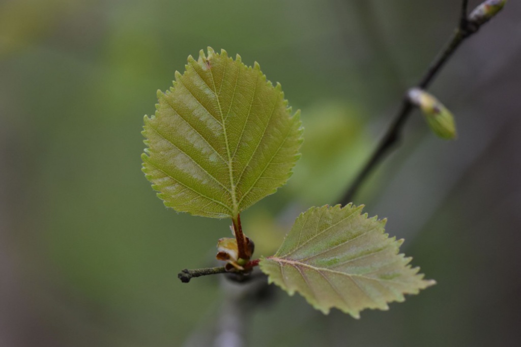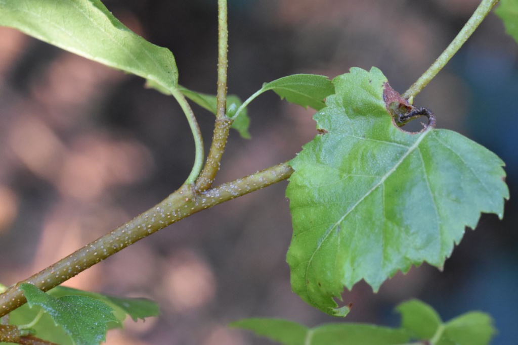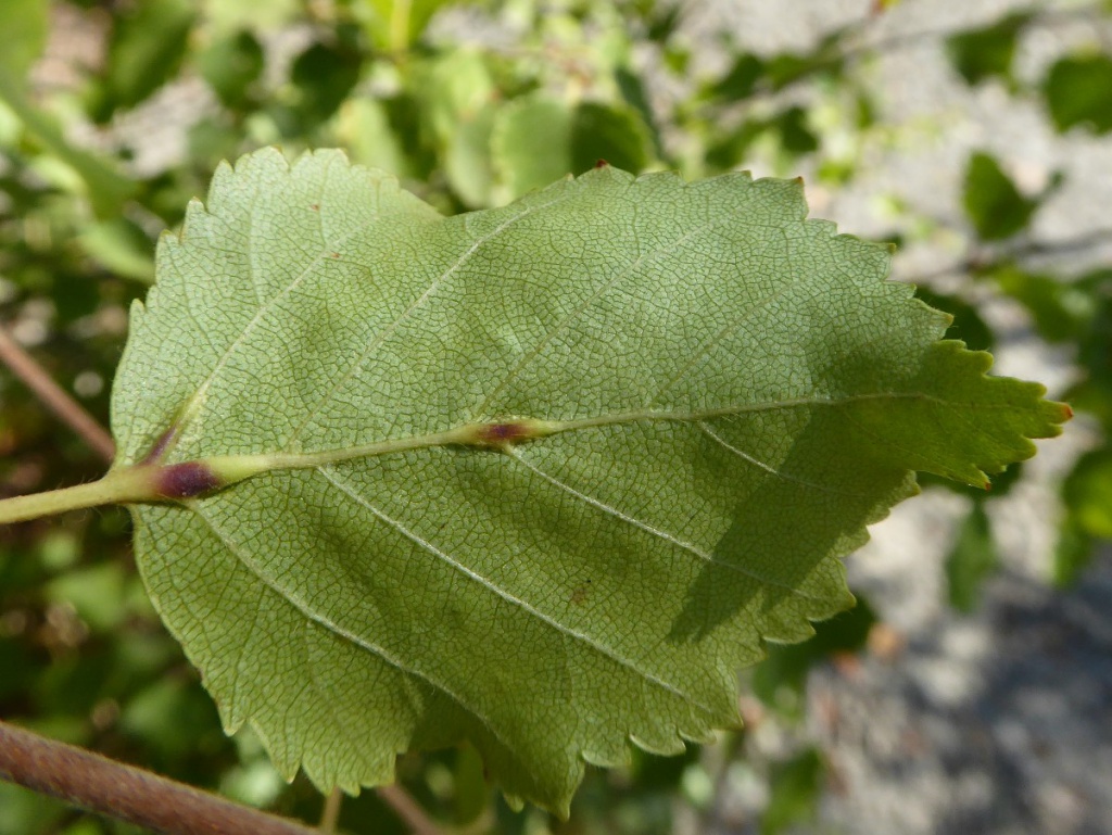 Leaves triangular and irregularly toothed, bi-serrate, with acuminate tips; glabrous when mature. Glabrous twigs, often with prominent paler warts - but note that young saplings and re-growth can have hairy twigs and leaves; in these case the leaf-shape should help to distinguish from Downy Birch.