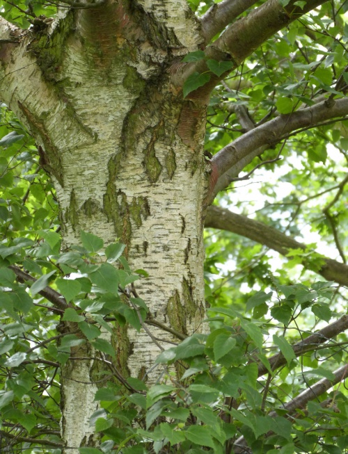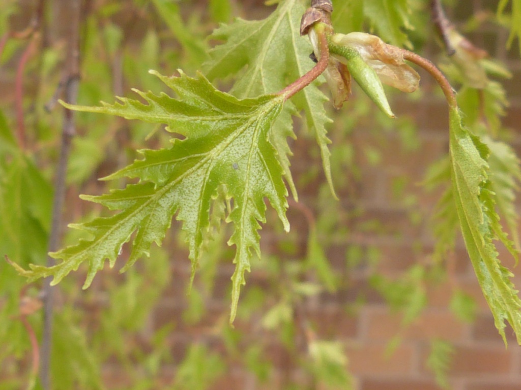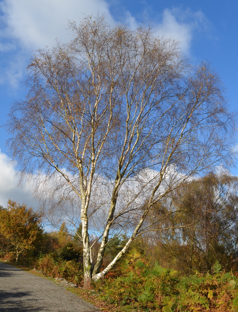 Downy Birch (Betula pubescens). Non-native species may be planted for ornament in parks, gardens and as street trees - Betula utilis v. jacquemontii (Himalayan Birch) and Betula papyrifera (Paper-bark Birch) are the most frequent; both have larger ovate leaves, and most cultivars have very white bark.