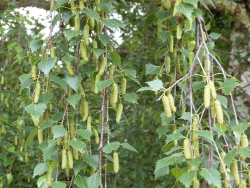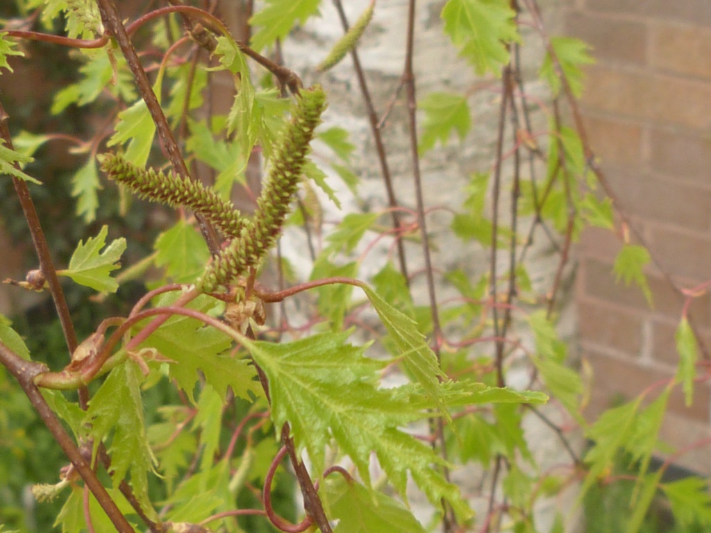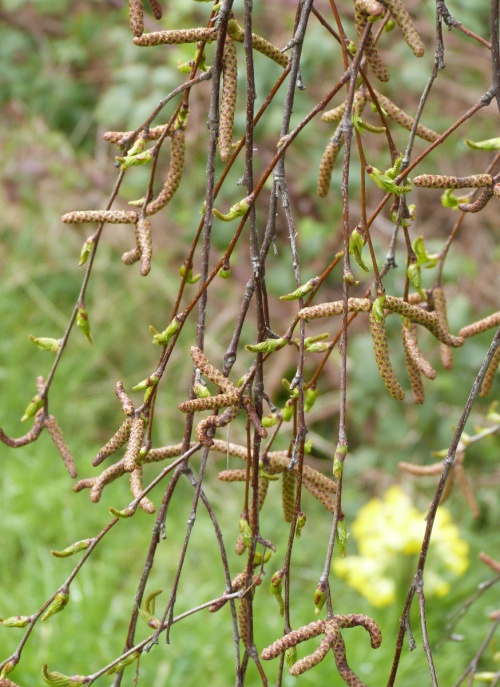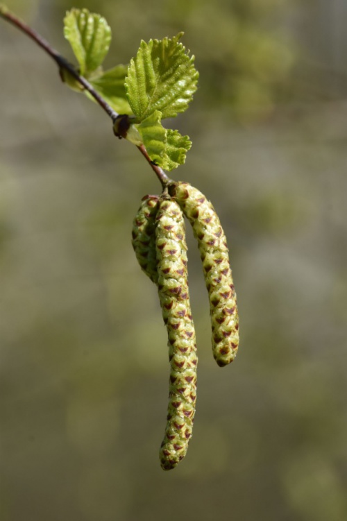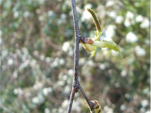 The yellow male catkins yellowish are present during winter, maturing with the leaves and then drooping. The female flower stands erect however.