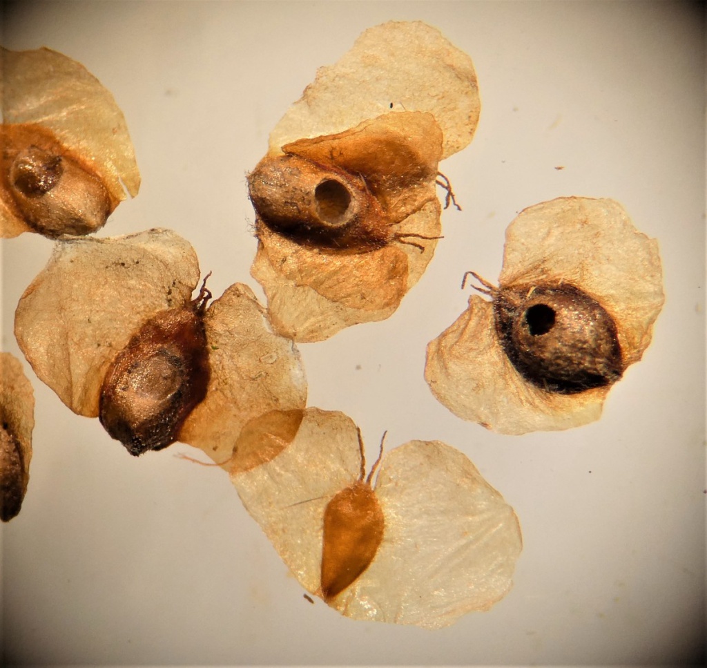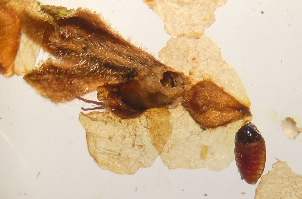 The larva of the gall midge Semudobia skuhravae galls the catkins of birch. The gall is fused to the spindle of the catkin between this and the scale and fruit. It is up to 2mm long, without a 'window-pit'